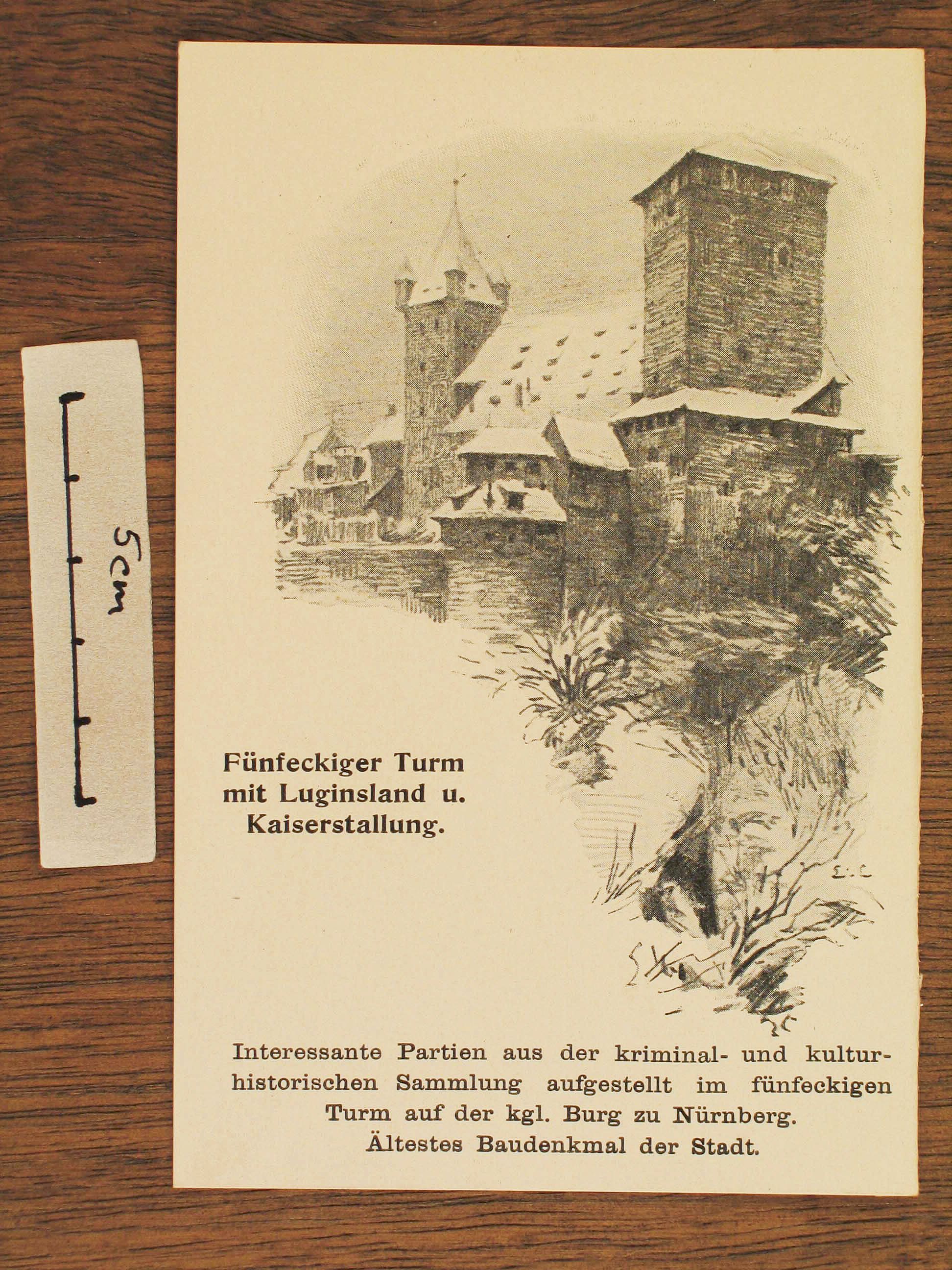 Der zu einem Umschlag gefaltete Bogen aus leichtem Karton zeigt sechs Innen- und Außenansichten der Burg zu Nürnberg (frühe Fotografien). Zu sehen sind ua das Kaminzimmer, ein Musikzimmer mit Nürnberger Trichter, die Waffensammlung, Eppeleins Gefängnis sowie eine Außenansicht der Burg (wobei die letztgenannten beiden Ansichten mit einer Schere von den übrigen getrennt wurden).
