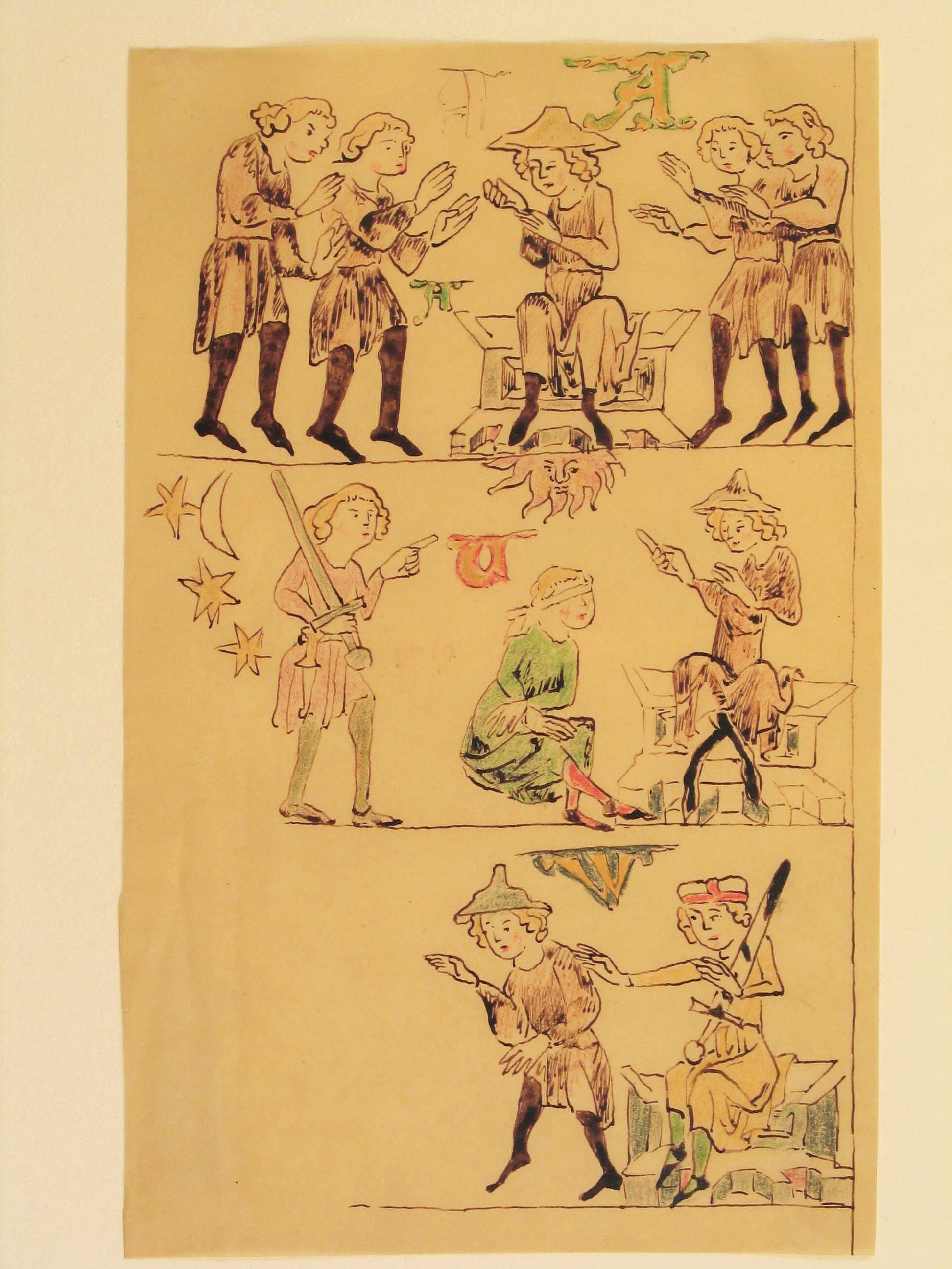 Farbige Tuschezeichnung auf Pauspapier mit drei Darstellungen. Die obere Darstellung zeigt in der Mitte einen sitzenden Menschen mit einem Hut. Links uns rechts von ihm stehen je zwei Menschen in braunen Gewändern und mit erhobenen Händen. Darunter sitzt rechts der Mensch mit einem Hut. Vor ihm sitzt auf dem Boden ein Mensch mit verbundenen Augen und Händen. Dahinter links steht ein Mann mit einem Schwert in der Hand. Auf der unteren Darstellung sitzt rechts ein Mann mit Schwert und Krone. Mit der rechten Hand greift er an die Schulter eines daneben stehenden Menschen. Dieser trägt braune Kleidung und einen Hut. Auf der Rückseite steht in der dazugehörige Text: "Alle werltlich gerichte hat begin von Kore . . . . . . ding mider sin geleit. "