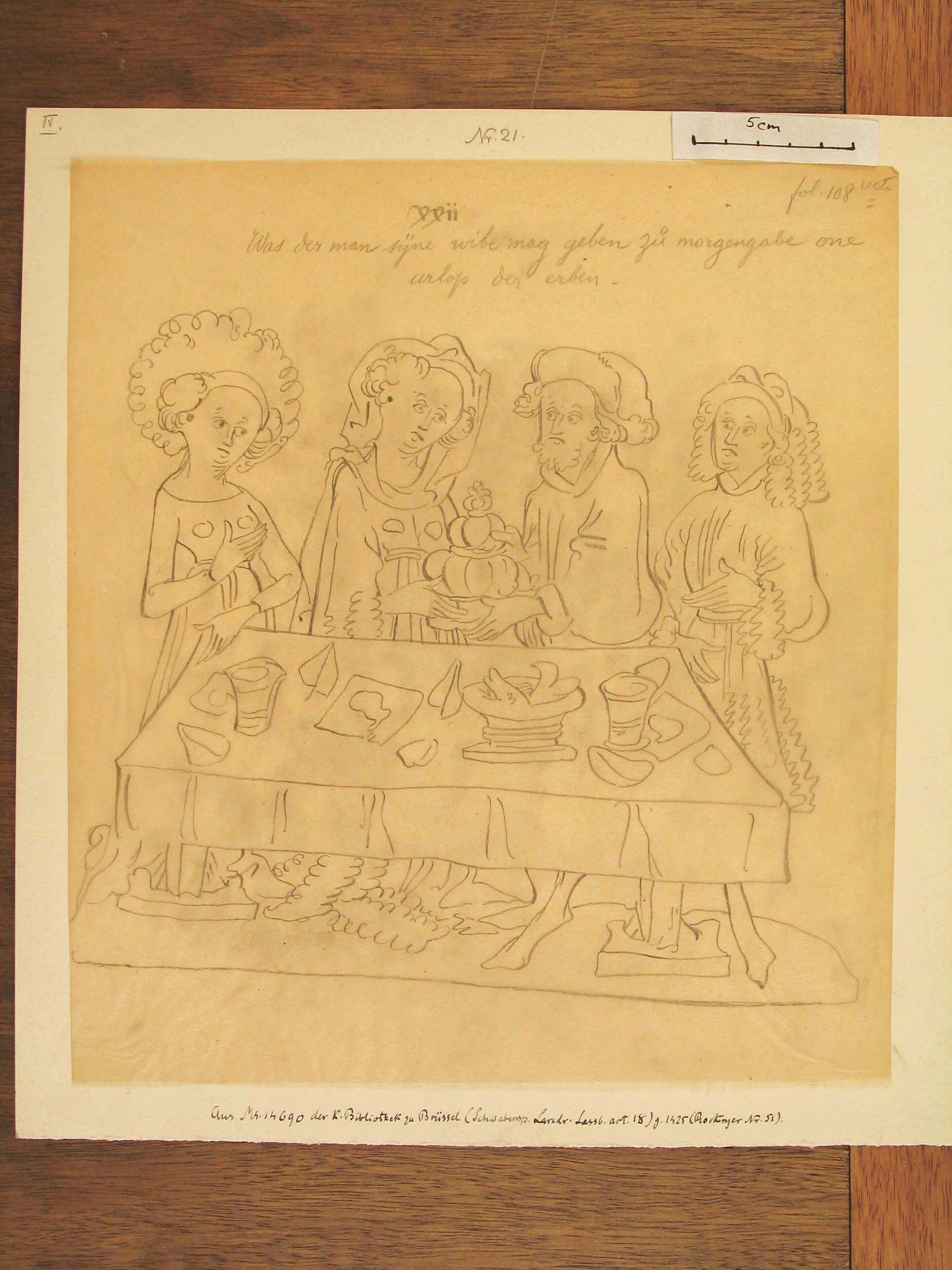 Bleistiftzeichnung auf Pauspapier. Dargestellt sind vier Personen an einem Tisch, auf dem mehrere Gegenstände liegen. Die beiden mittleren Personen sind ein Ehepaar. Der Mann übergibt der Frau einen größeren Gegenstand. Ganz lienks steht eine weitere Frau, rechts ein Mann. Überschrift über dem Blatt: "XXii Was der man syne wibe mag geben zu morgengabe one urlop der erben. "