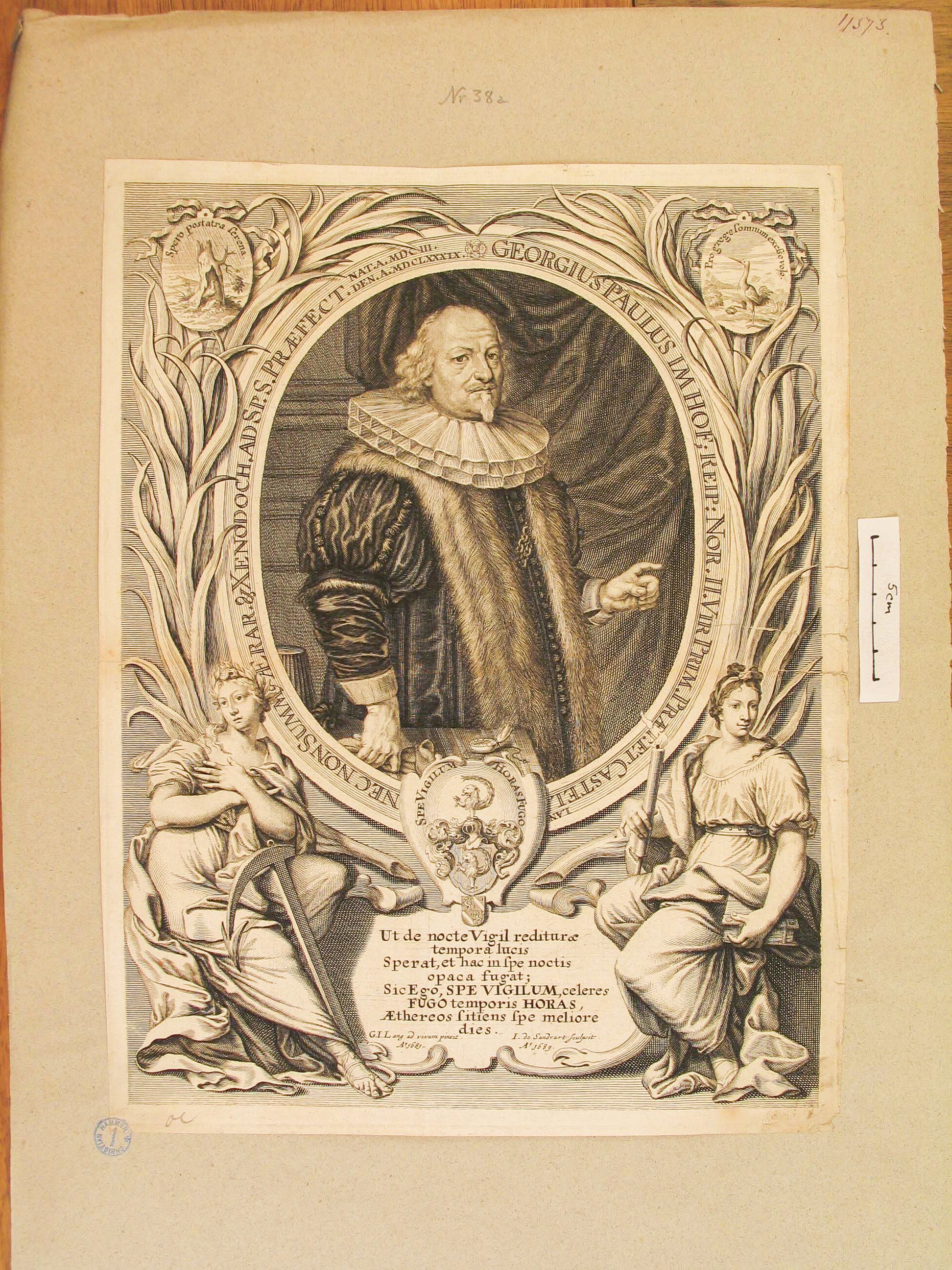 Das Bild zeigt einen Ratsherren mit schütterem grauen Haar, einem spitzen Bart, breiter Halskrause und einem mit Fell besetztem Mantel. Er hebt leicht die links Hand, während die rechte auf einem Tisch ruht. Die ovale Darstellung ist umschrieben: "Georgius Paulus im Hof; Reip:Nor. II. Vir Prim. Praet. et Castellan nec non Summae rar. &Xenodoch. ad Sp. S. Praefect. Nat. A. MDCIII. Den. A. MDCLXXXIX. " Unter der ovalen Darstellung befindet sich ein Wappen. Darunter steht ein mehrzeiliger lateinischer Text, rechts und links umgeben von je einer allegorischen Frauendarstellung, von denen die links mit einem Anker versehen ist.