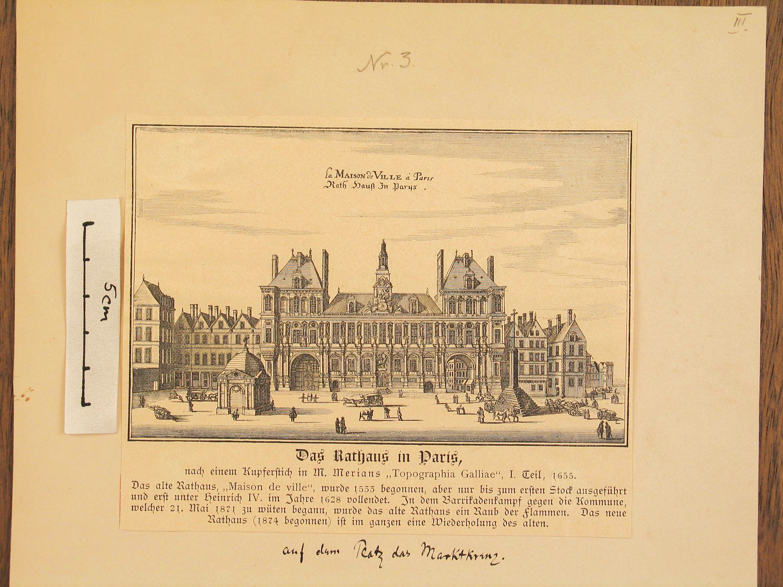 Dargestellt ist ein großes Gebäude mit zentralen Mittelgebäude und kleinen Nebengebäuden. Davor befindet sich ein Platz, auf dem links ein kleineres Gebäude steht, rechts aber eine Säule auf der sich ein hohes Kreuz befindet. Der Platz ist bevölkert von zahlreichen Menschen und Kutschen. Unter dem Bild der dazugehörige Text: "Das alte Rathaus, "Maison de ville", wurde 1533 begonnen, aber nur bis zum ersten Stock aunsgeführt und erst unter Heintich IV. im Jahre 1628 vollendet. In dem Barrikadenkampf gegen die Kommune, welcher 21. Mai 1871 zu wüten begann, wurde das alte Rathaus ein Raub der Flammen. Das neue Rathaus (1874 begonnen) ist im ganzen eine Wiederholung des alten".