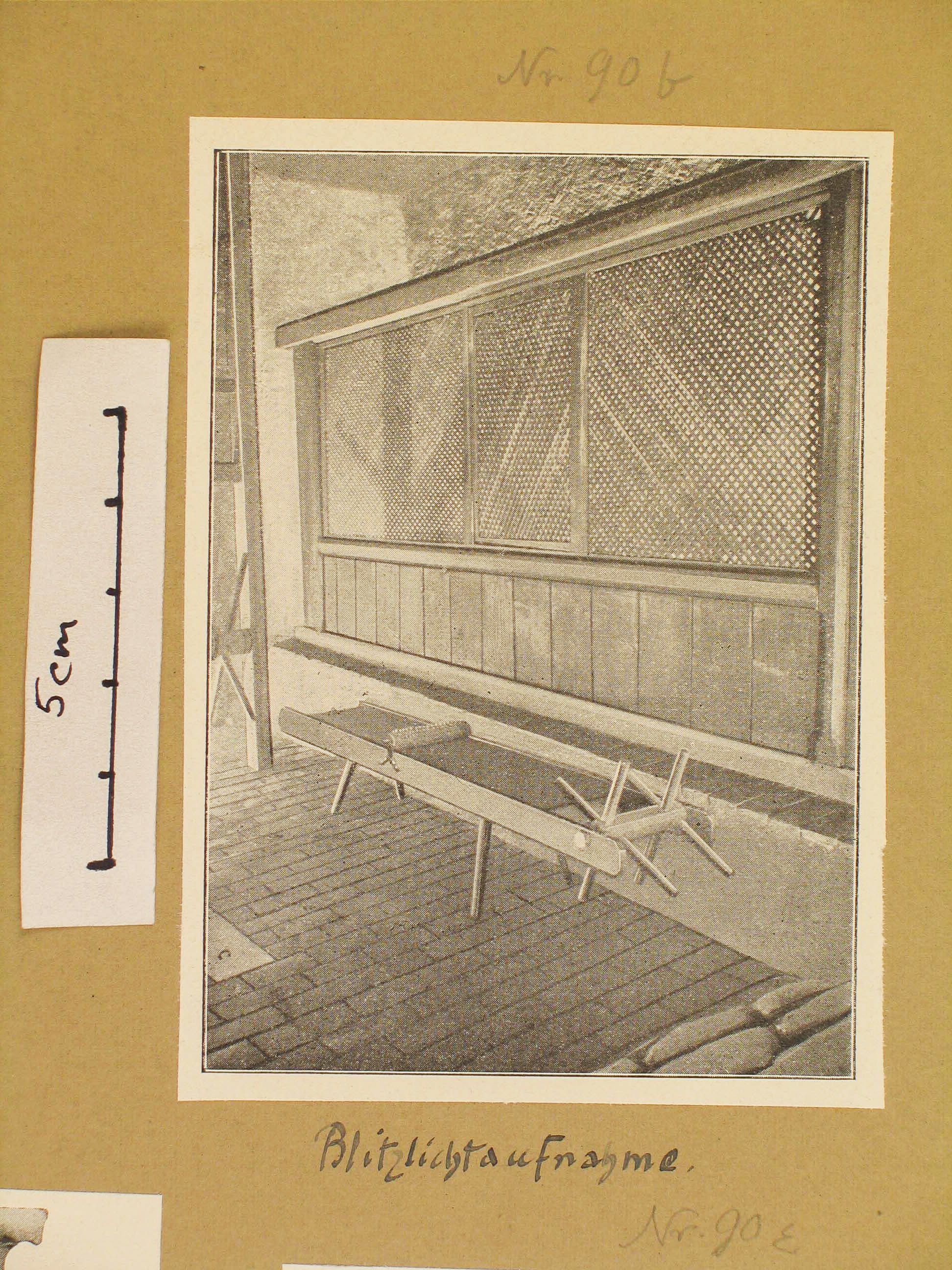 Oben rechts (90b) ist in einem Raum eine Streckbank dargestellt. Dahinter befindet sich eine Wand mit kleinen Gitterchen. Unter beiden oberen Aufnahmen steht: "Blitzlichtaufnahme".