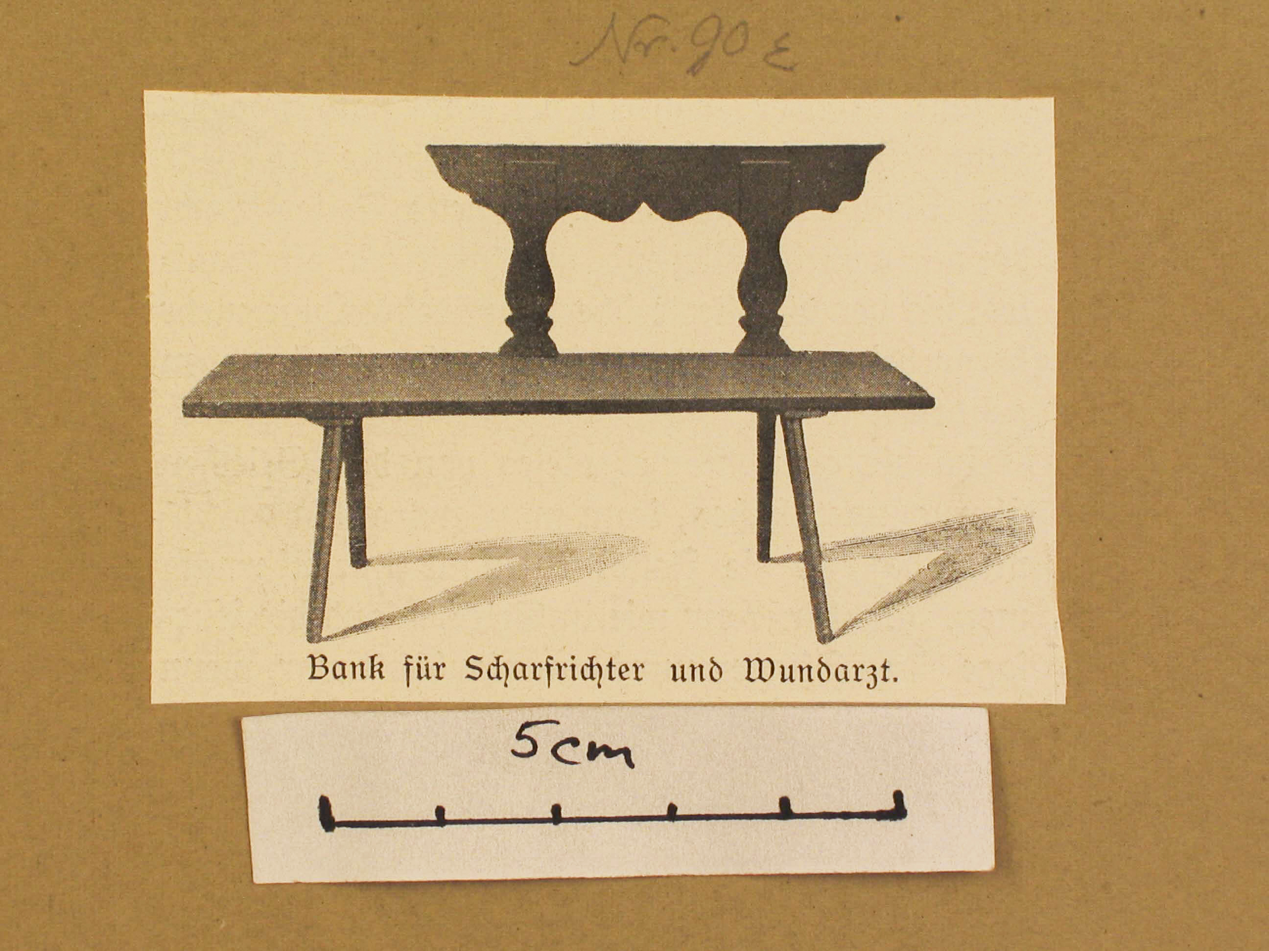 Unten rechts (90e) die Bank für Scharfrichter und Wundarzt, eine Bank mit einer Rückenlehne, die nur über die Hälfte der Bank reicht.