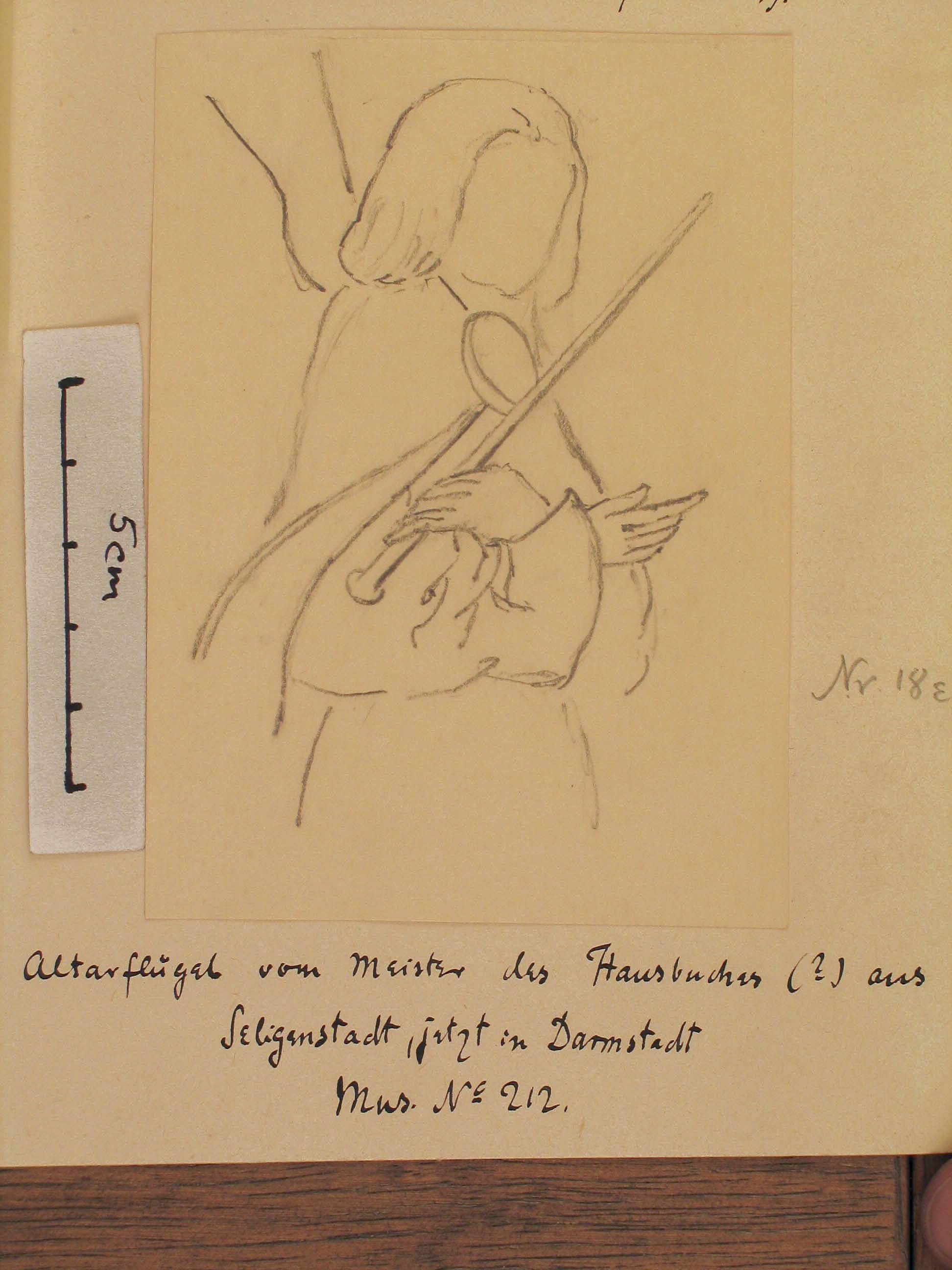 Sechs Darstellungen. Nr. 18a zeigt einen Engel mit Stab, an dessen Spitze sich ein Kreiz befindet. Unterschrift: "Cod. Egberti (c. 980) fol. 9 (Kraus Taf. IX. ). " Nr. 18b zeigt eine Heilige mit einem Kreuz in der Hand. Unterschrift: "Thürflügel des Nordportals bei S. Maria a. d. Capitol zu Cöln c. 1100 (Aus´m Weerth, Kunstdenkmäler Taf. XXXX. )" Nr. 18c zeigt einen Engel mit einem Stab. Unterschrift: "Elfenbein in der Dombibliothek zu Trier, XII. Jahrhund. (aus´m Weerth Kunstdenkm. Taf. LVIII No. 4). " Nr. 18d zeigt einen Engel mit Stab in der Hand. Unterschrift: "Vom Stab des Erzb. Egilbert v. Trier +1101 (aus´m Weerth Kunstdenkm. T. LVI, 3. )" Nr. 18e zeigt einen laufenden Menschen mit einem Stab in der Hand. Unterschrift: "Bischofs-Stab im Dom zu Bamberg, XI. Jahrh. ? (Hefner, Trachten I 39. )" Nr. 18e [ muß 18 f heißen ] zeigt den Oberkörper eines Engels mit Stab. Unterschrift: "Altarflügel vom Meister des Hausbuches (?) aus Seligenstadt, jetzt Darmstadt Mus. No. 212. )"