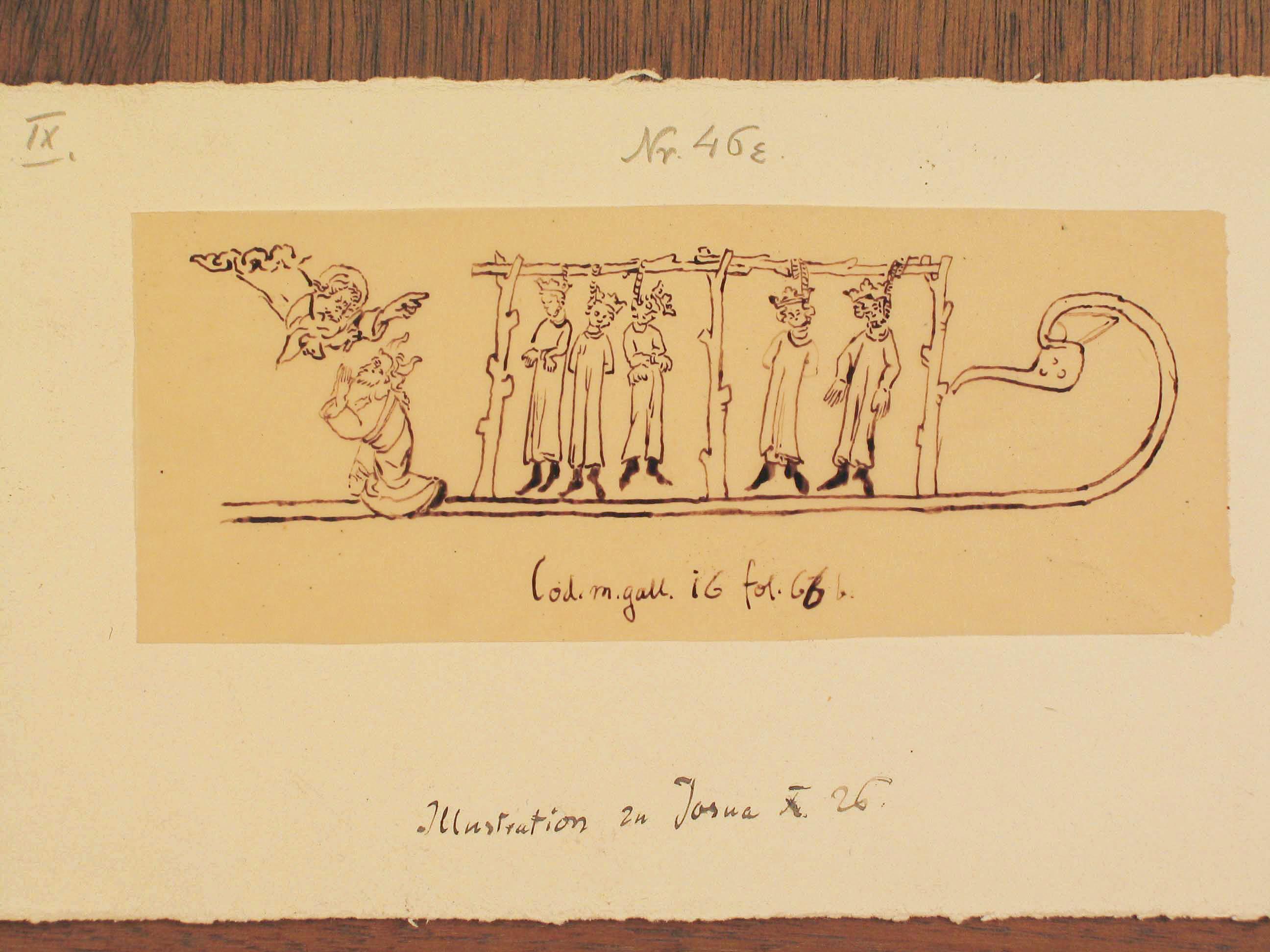 Die Tuschezeichnung auf Pauspapier zeigt zwei große Bäume, an denen insgesamt 15 Gehenkte hängen. Diese sind mit den Hälsen unmittelbar unterhalb von massiven Ästen aufgeknüpft; ihre Hände sind auf den Rücken gefesselt.