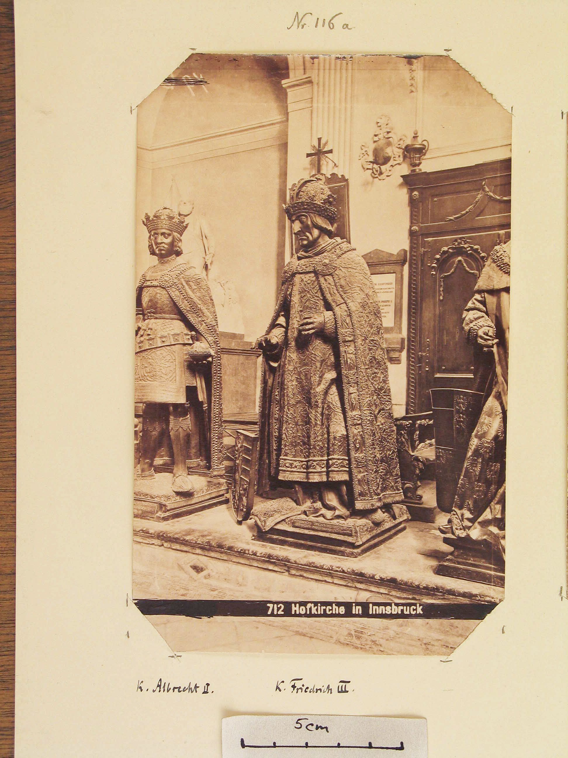 Die beiden Fotos zeigen insgesamt secchs Herrscherstandbilder. Auf dem linken sind K. Albrecht II. und K. Friedrich III. ; auf dem rechten K. Albrecht II. , K. Friedrich III. , Mgr. Leopold d. It. , Rudolf IV.