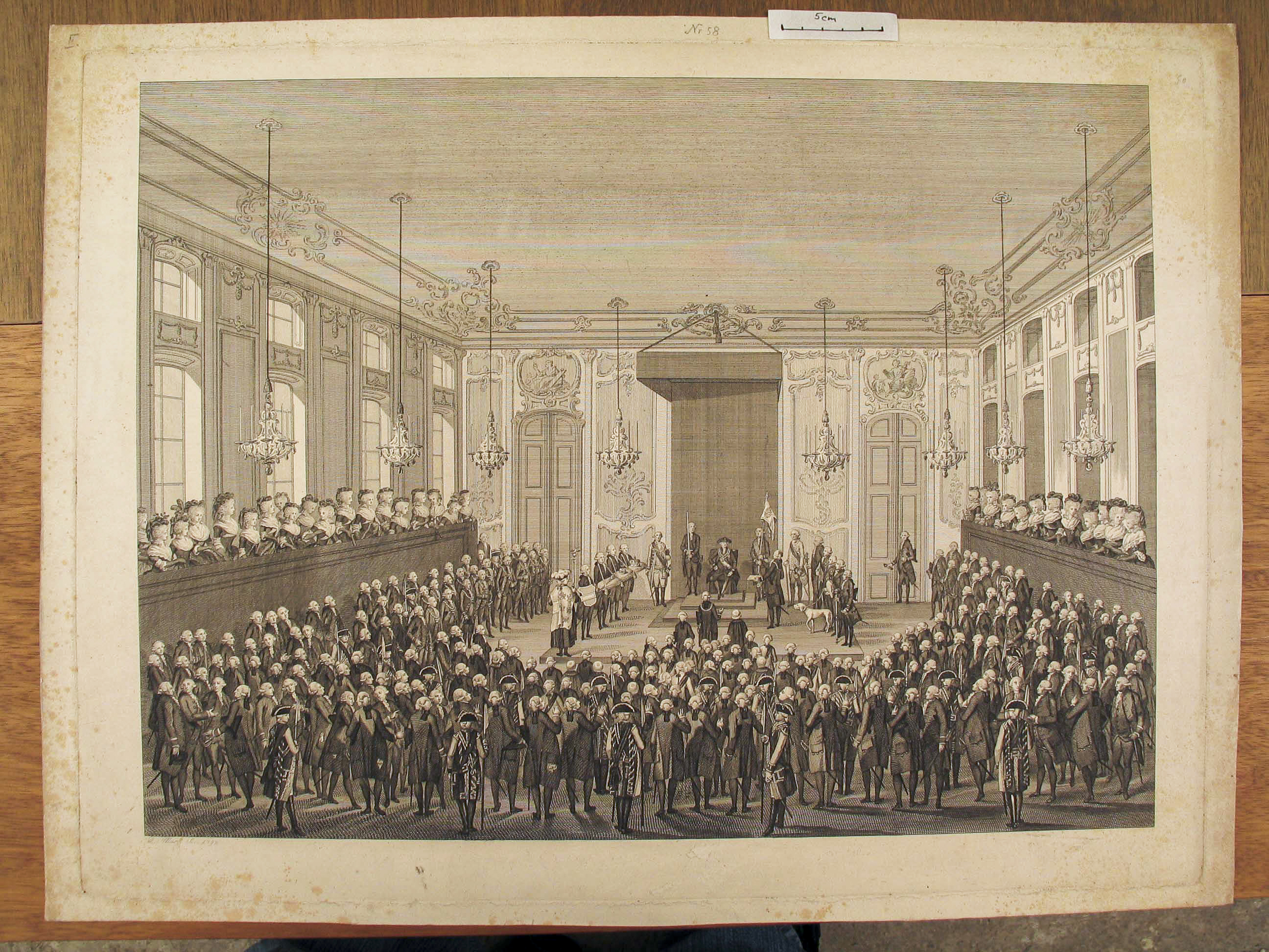 Dargestellt ist in etwa die Szene von Nr. 1542, nur daß hier der Raum wesentlich größer und aufgrund einiger Deckenleuchter und Wandgemälde prächtiger ist. Wiederum stehen Männer um den Thron und diesem gegenüber, allerdings tragen drei Männer die Insignien: Krone, Reichsapfel, Zepter. Von zwei Galerien aus wohnen zahlreiche Frauen der Zeremonie bei. Eine Bezeichnung der abgebildeten Personen oder nähere Beschreibung des Geschehens fehlt.