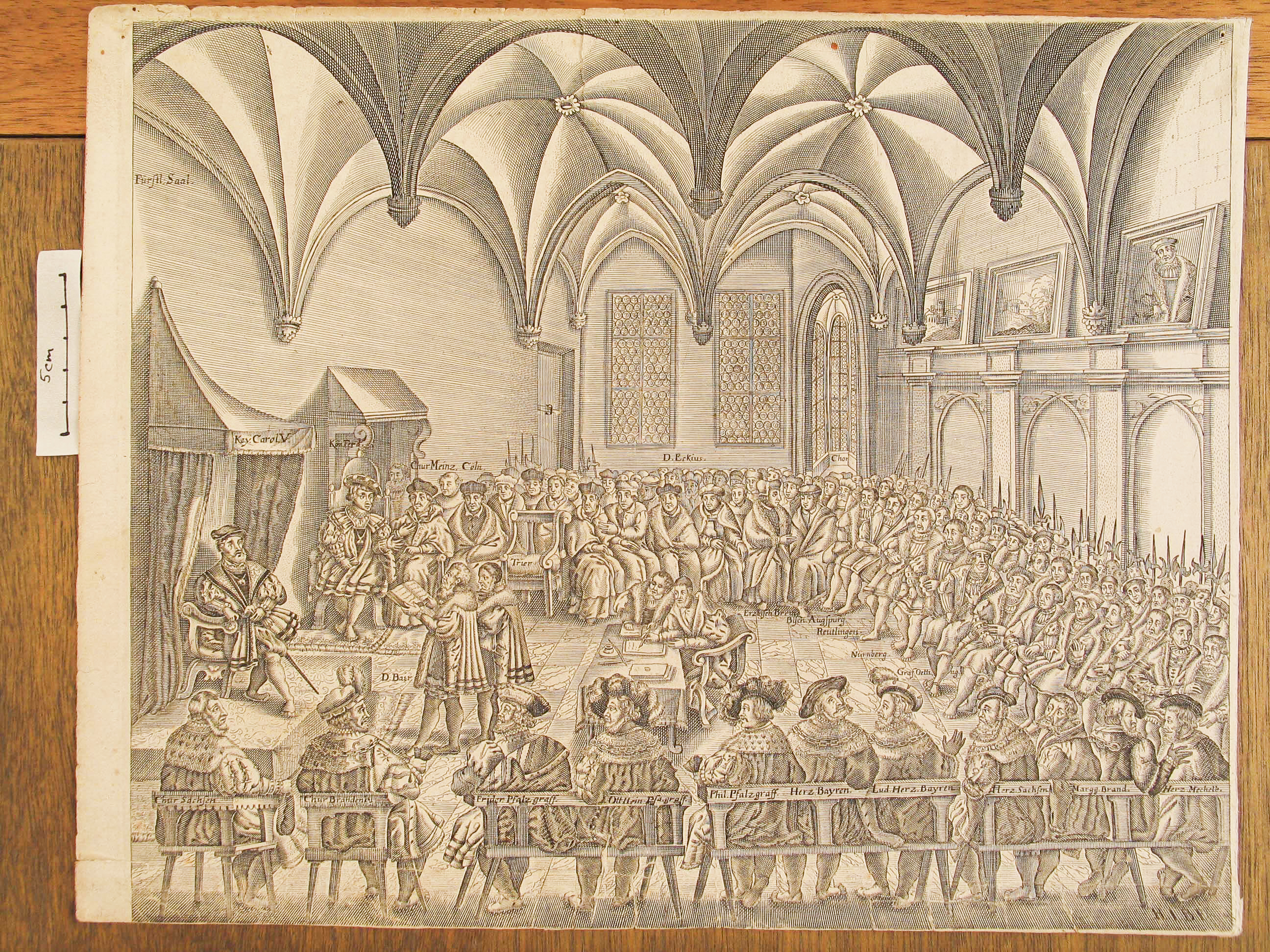 Der Kupferstich, der aus einem Folianten entnommen scheint, zeigt eine Szene in einem geschlossenen Raum mit Gewölbe. In einem einseitig offenen Viereck sitzen zahlreiche Männer. In der Mitte steht ein Tisch, an dem zwei Männer sitzen und schreiben. Auf der offenen Seite des Vierecks (im Bild links) sitzt auf einem Podest ein Mann mit Umhang und Schwert unter einem Baldachin. Vor ihm stehen zwei Männer, die dem Mann unter dem Baldachin eine Urkunde vorlesen. Die Stühle, auf denen die Anwesenden sitzen, sind zum Teil beschriftet.