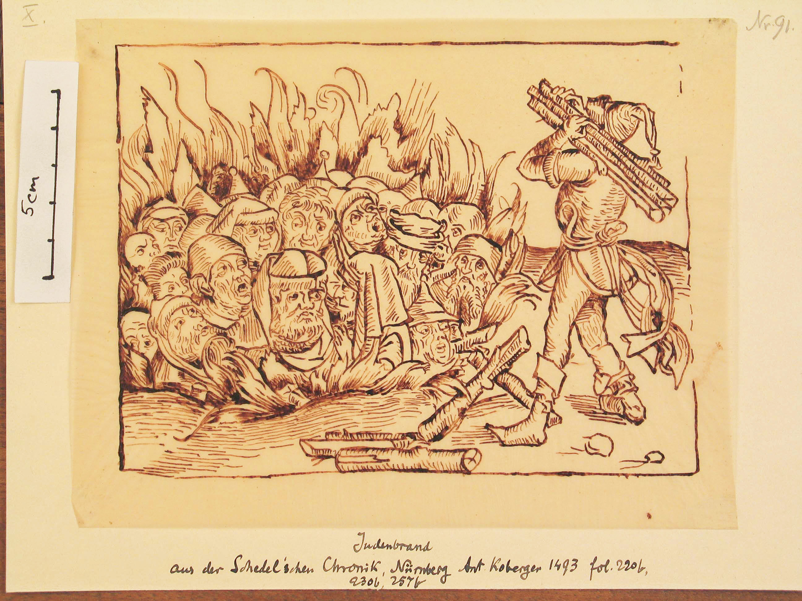 Die Tuschezeichnung auf Pauspapier zeigt einen lodernden Scheiterhaufen, aus dem zahllose Köpfe herausragen. Es sind mehrere spitze Judenhüte auszumachen. Ein Knecht bringt gerade Holz, um das Feuer nachzuschüren.