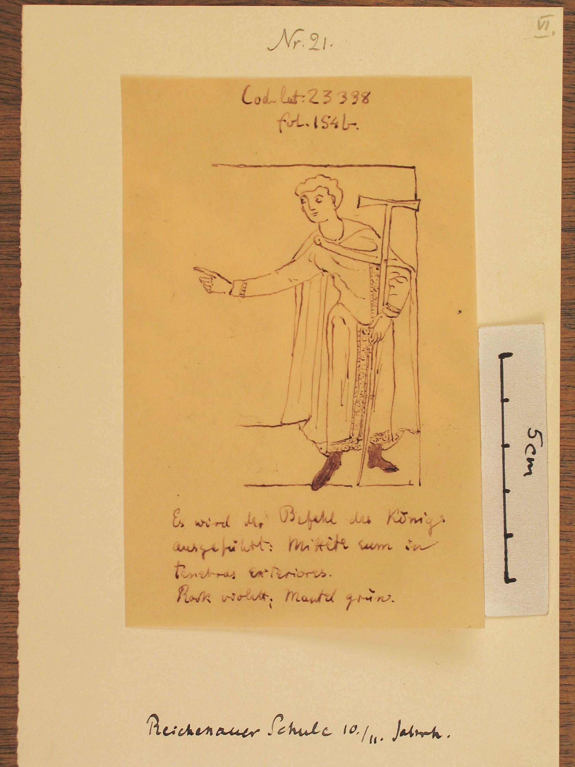 Tuschezeichnung auf Pauspapier. Dargestellt ist ein Mann mit Umhang und einem mannshohen Stab. Mit der rechten Hand zeigt er zur Seite. Unter dem Bild: "Es wird der Befehl des Königs ausgeführt: . . . . . . . . Rock violett; Mantel grün. "