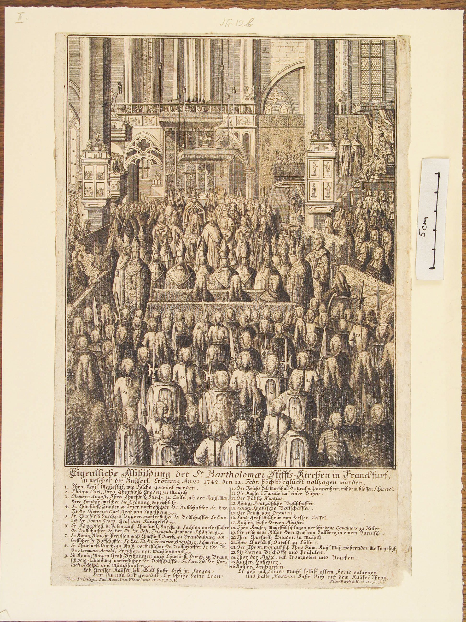Der Kupferstich zeigt, wie gerade der römische Kaiser gekrönt wird. Alle anwesenden Personen tragen eine kleine Nummer und werden in einer Legende unter dem Bild näher vorgestellt. Bildunterschrift: "Eigentliche Abbildung der St. Bartholomai Stiffts - Kirche in Frankfurt, in welcher die Kayserl. Krönung anno 1742 den 12. Febr. höchstbeglückt vollzogen worden. "