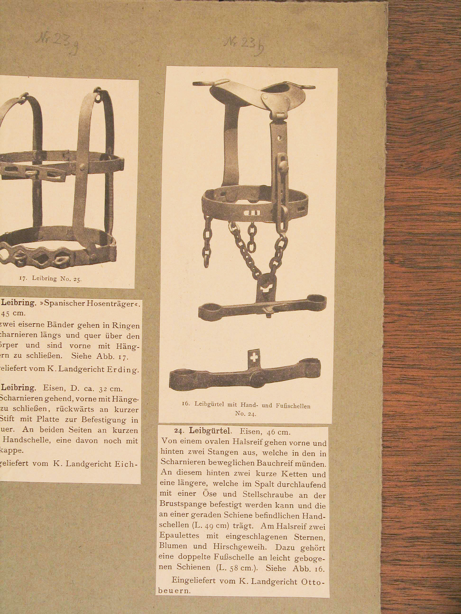 2. Darstellung: Leibgürtel mit Hand- und Fußschellen, d. h. von einem ovalen Halsreif gehen vorne und hinten zwei Stangen aus, welche in den in Scharnieren beweglichen Bauchreif münden. An diesem hinten zwei kurze Ketten und eine längere, welche im Spalt durchlaufend mit einer Öse und Stellschraube an der Brustspange befestigt werden kann und die an einer geraden Schiene befindlichen Handschellen trägt. Am Halsreif zwei Epaulettes mit eingeschlagenen Sternen, Blumen und Hirschgeweih. Dazu gehört eine doppelte Fußschelle an leicht gebogenen Schienen.