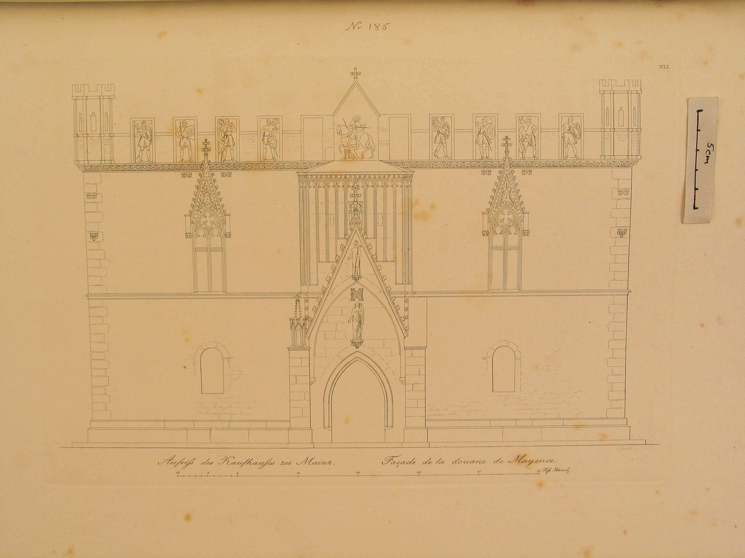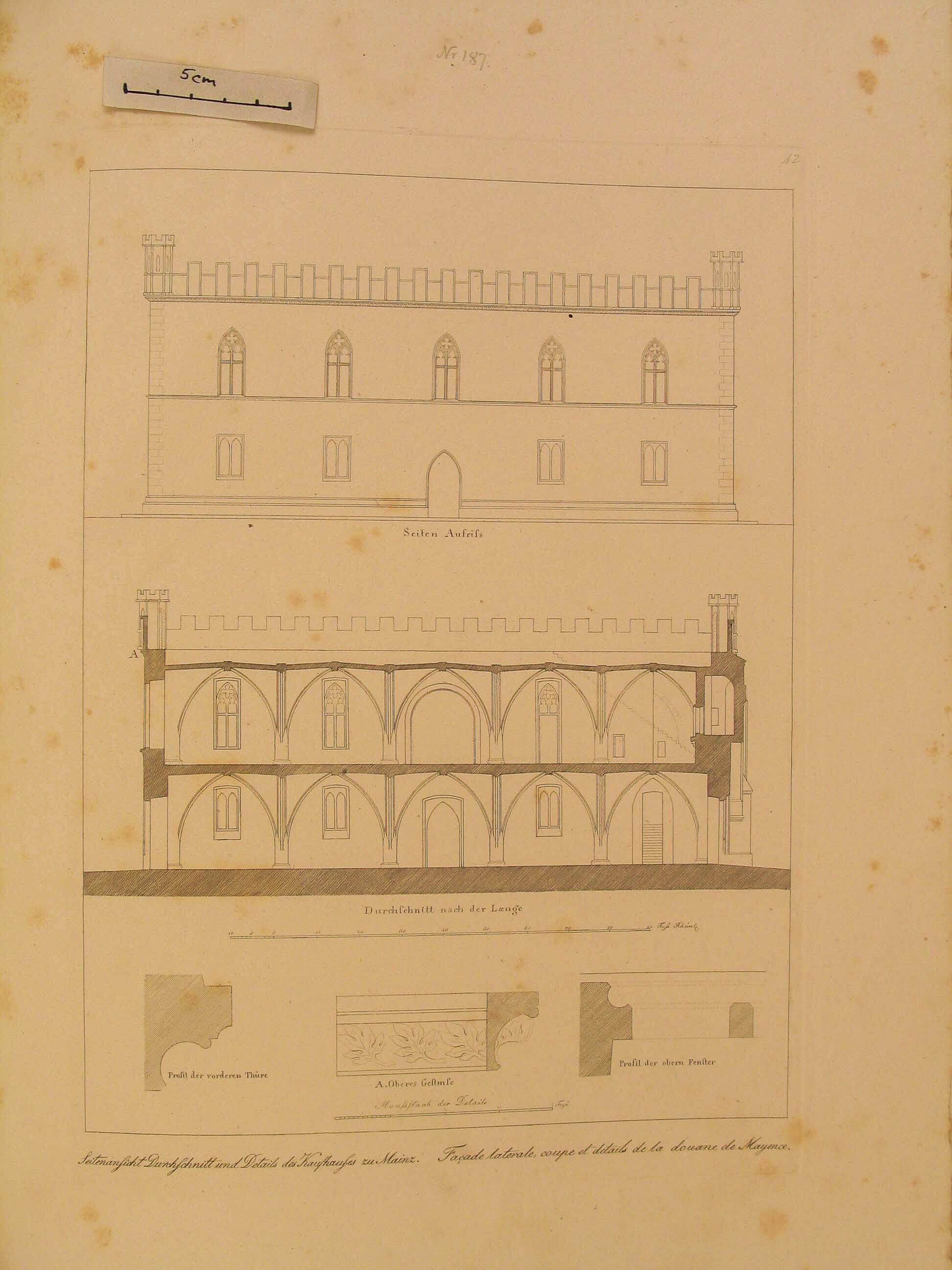 Die Mappe mit o. a. Aufschrift enthält fünf gleichgroße Blätter mit verschiedenen Ansichten und Darstellungen desselben Gebäudes. Die Titel lauten: "Grundriß des Kaufhauses zu Mainz", "Perspectivische Ansicht des Kaufhauses zu Mainz", "Aufriß des Kaufhauses zu Mainz", "Seitenansicht Durchschnitt und Details des Kaufhauses zu Mainz" und "Innere Ansicht des Kaufhauses zu Mainz".