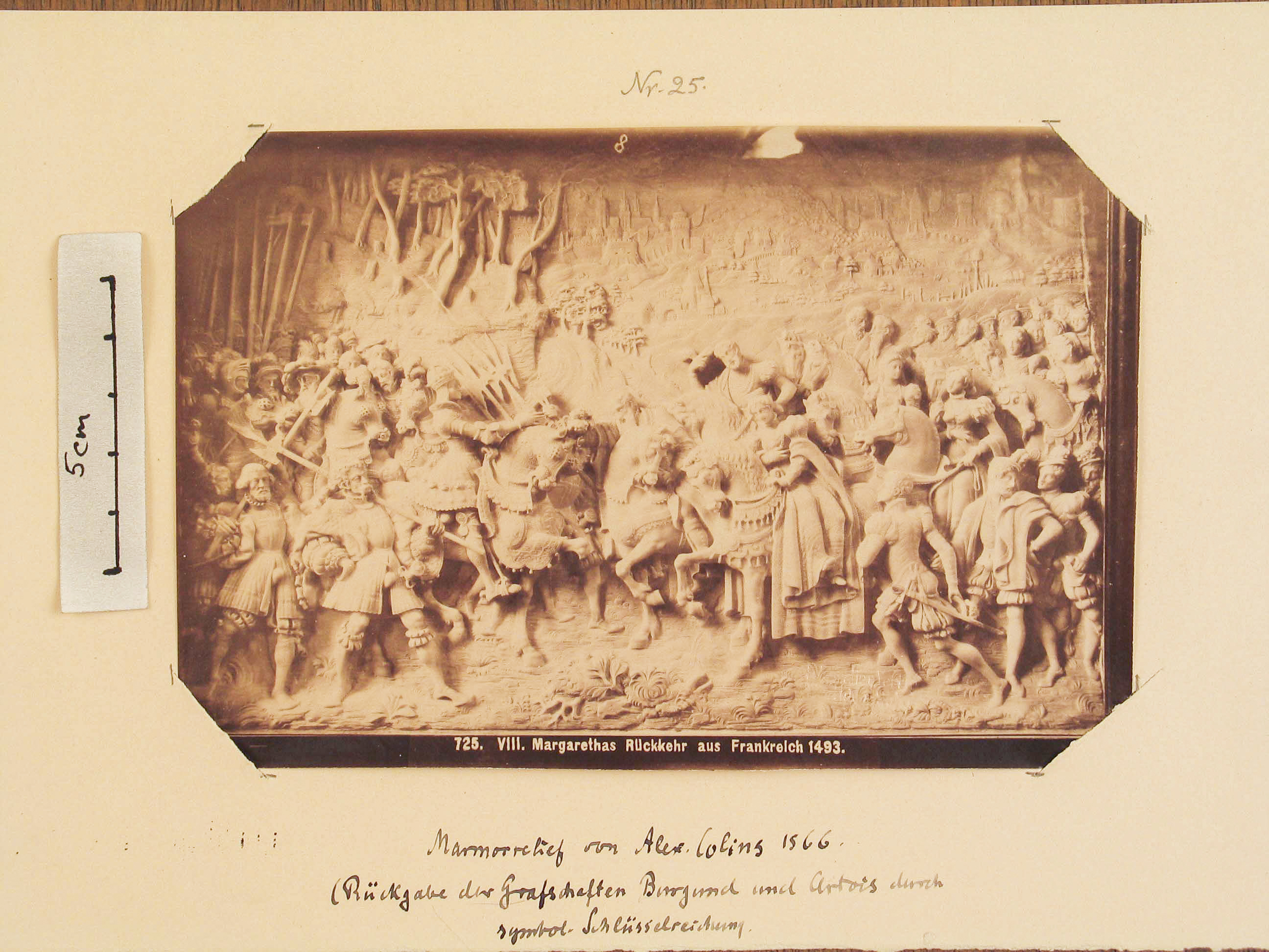 Marmorrefief von Alex. Colins 1566. (Rückgabe der Grafschaften Burgund und Artois durch symbol. Schlüsselreichung.)Inhalt