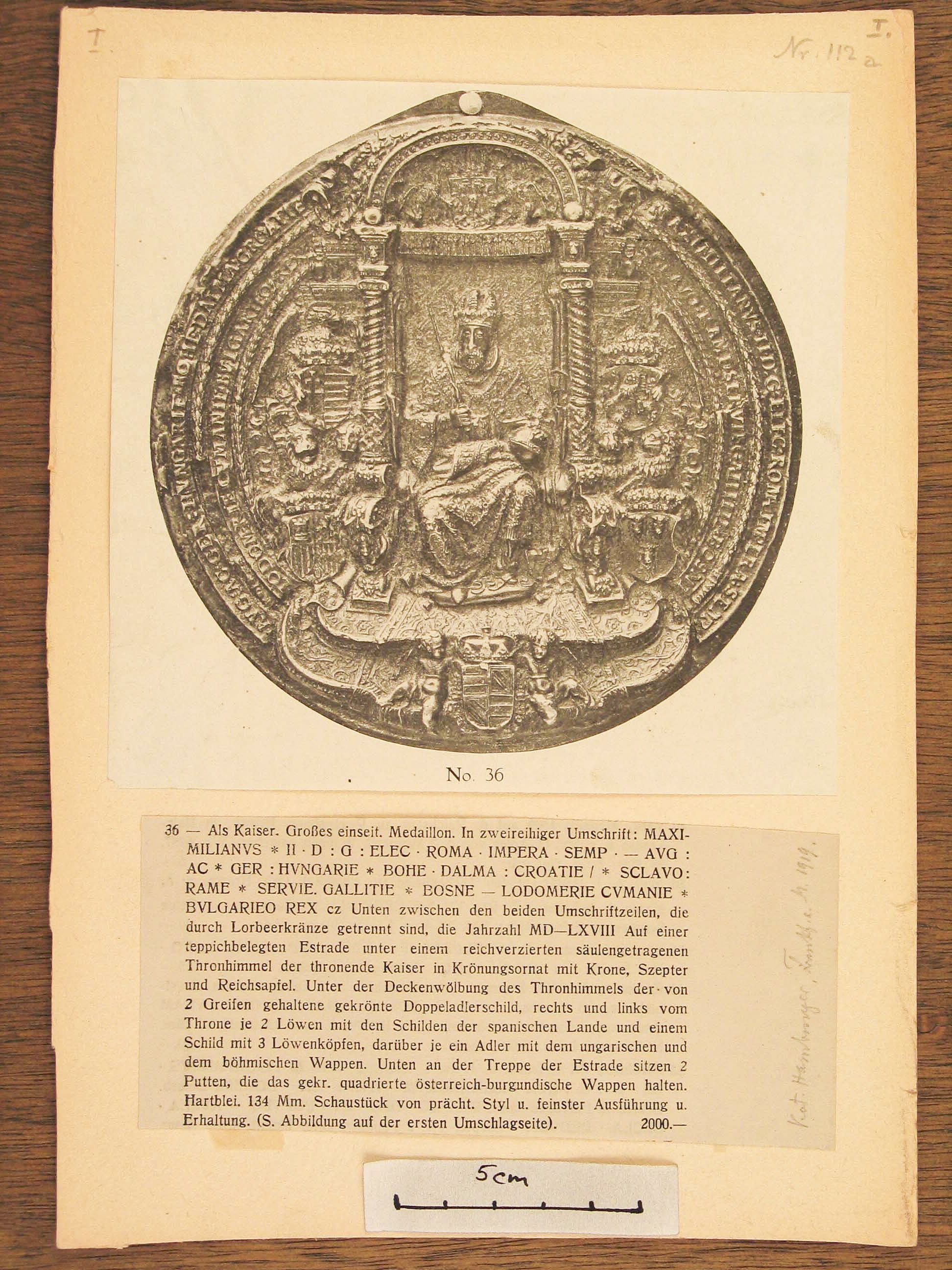 Das Blatt trägt einen Offsetdruck und einen Hochdruck (Text), die wohl einem Ausstellungskatalog entnommen sind. Der Offsetdruck zeigt verschwommen ein rundes Metallstück, auf dem reliefartig ein Mann mit Krone abgebildet ist. Dieser sitzt unter einem Torbogen, vermutlich auf einem Thron. Ringsum läuft ein eingravierter Text. Der Hochdruck (Text) nimmt Bezug auf das Bild.