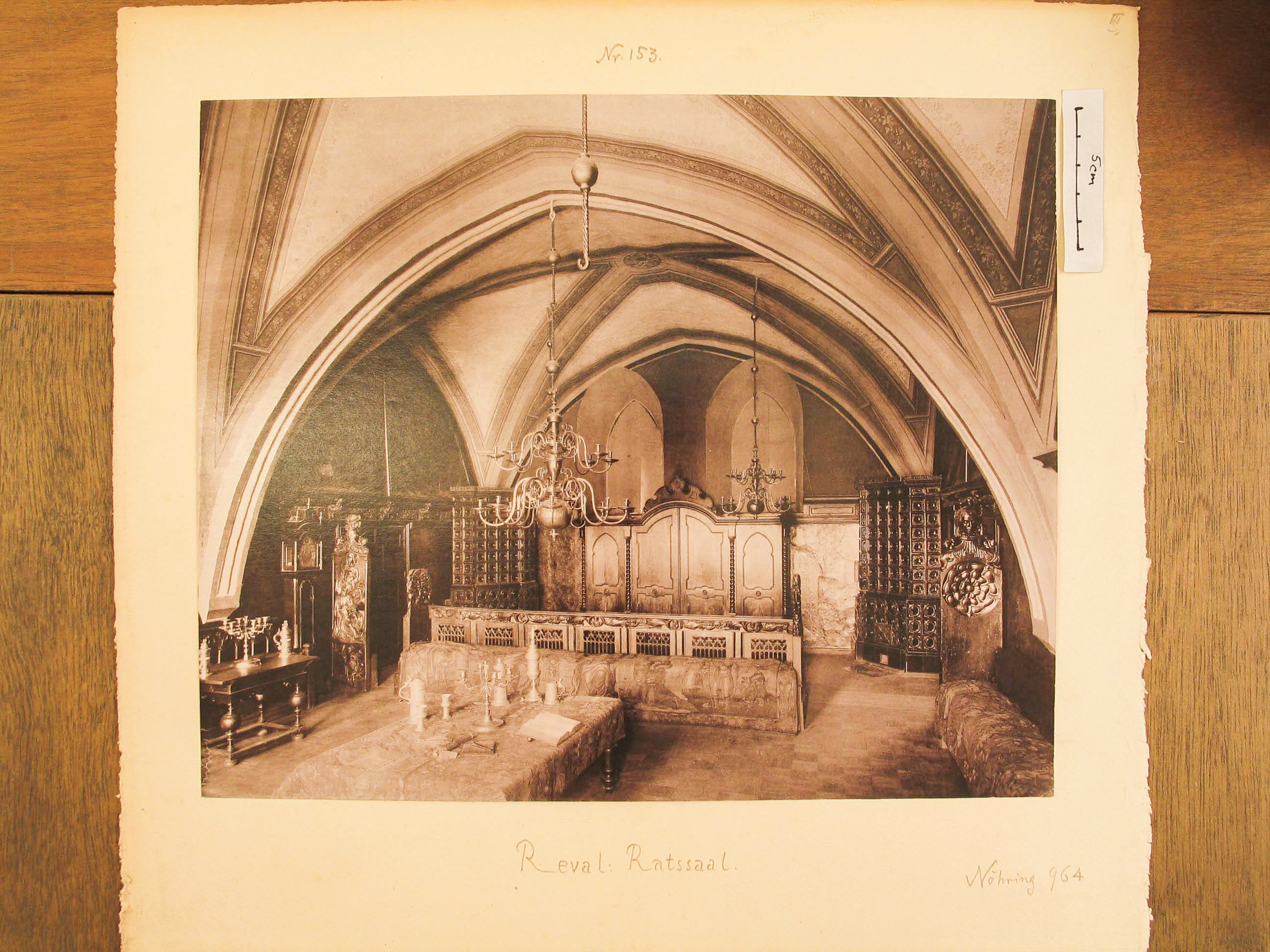 Das Bild zeigt einen Saal mit einer gewölbten Decke, die von Bögen gehalten wird. Von der Decke hängen zwei Leuchter. Im Saal stehen verschiedene Möbelm wie Tische und gepolsterte Sitzbänke an den Wänden. In den Ecken stehen zwei Kachelöfen. Auf dem Tisch im Vordergrund stehen Leuchter, Becher , Karaffen und liegt ein aufgeschlagenes Buch.