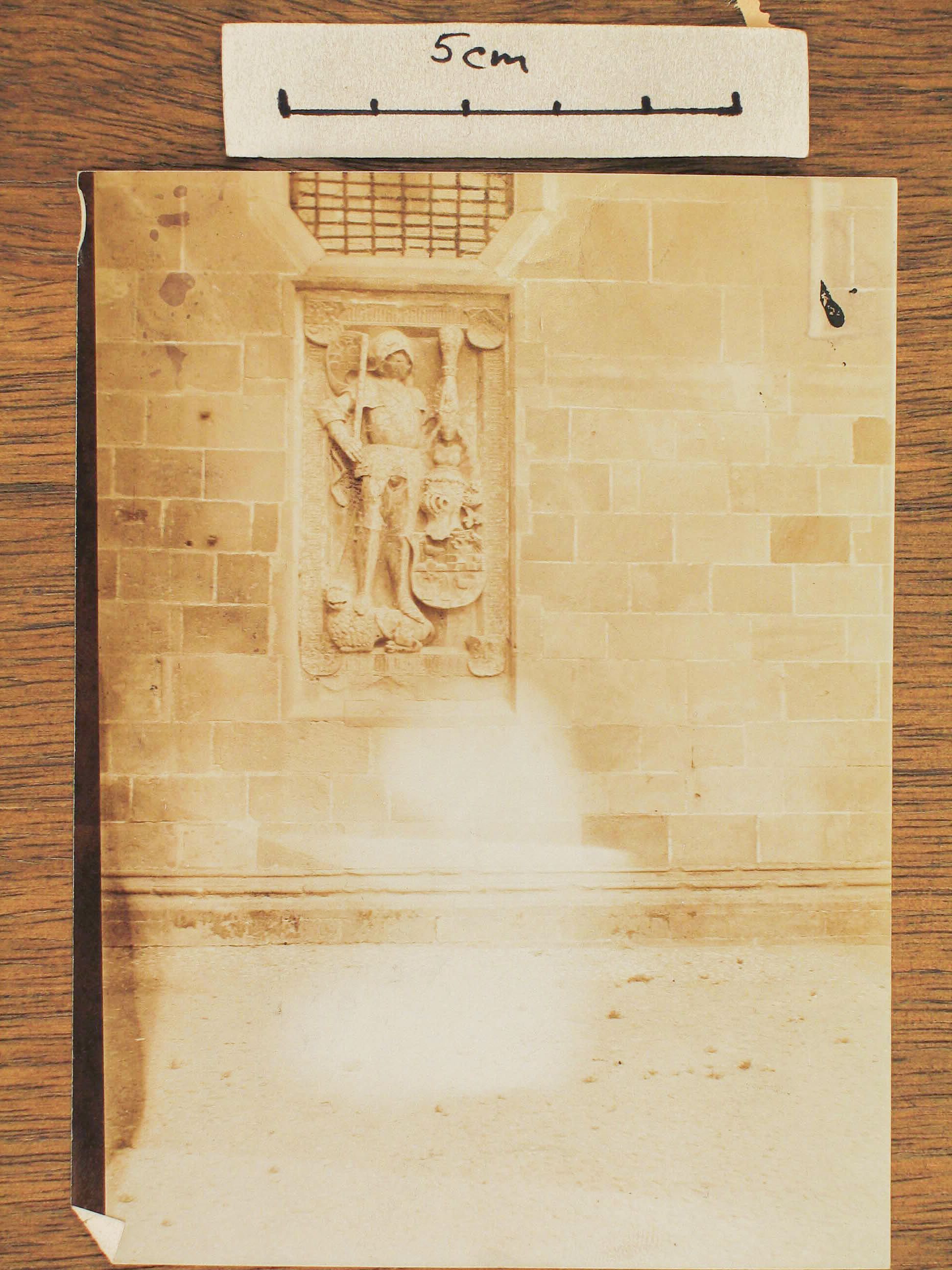 Das Foto zeigt eine steinerne Wand. Darin eingelassen ist die Darstellung eines Ritters mit Rüstung und geschlossenem Visier, der auf einem Tier steht. (Schaf ? / Drache - Heiliger Georg?) Neben dem Ritter ist noch ein Wappen abgebildet.
