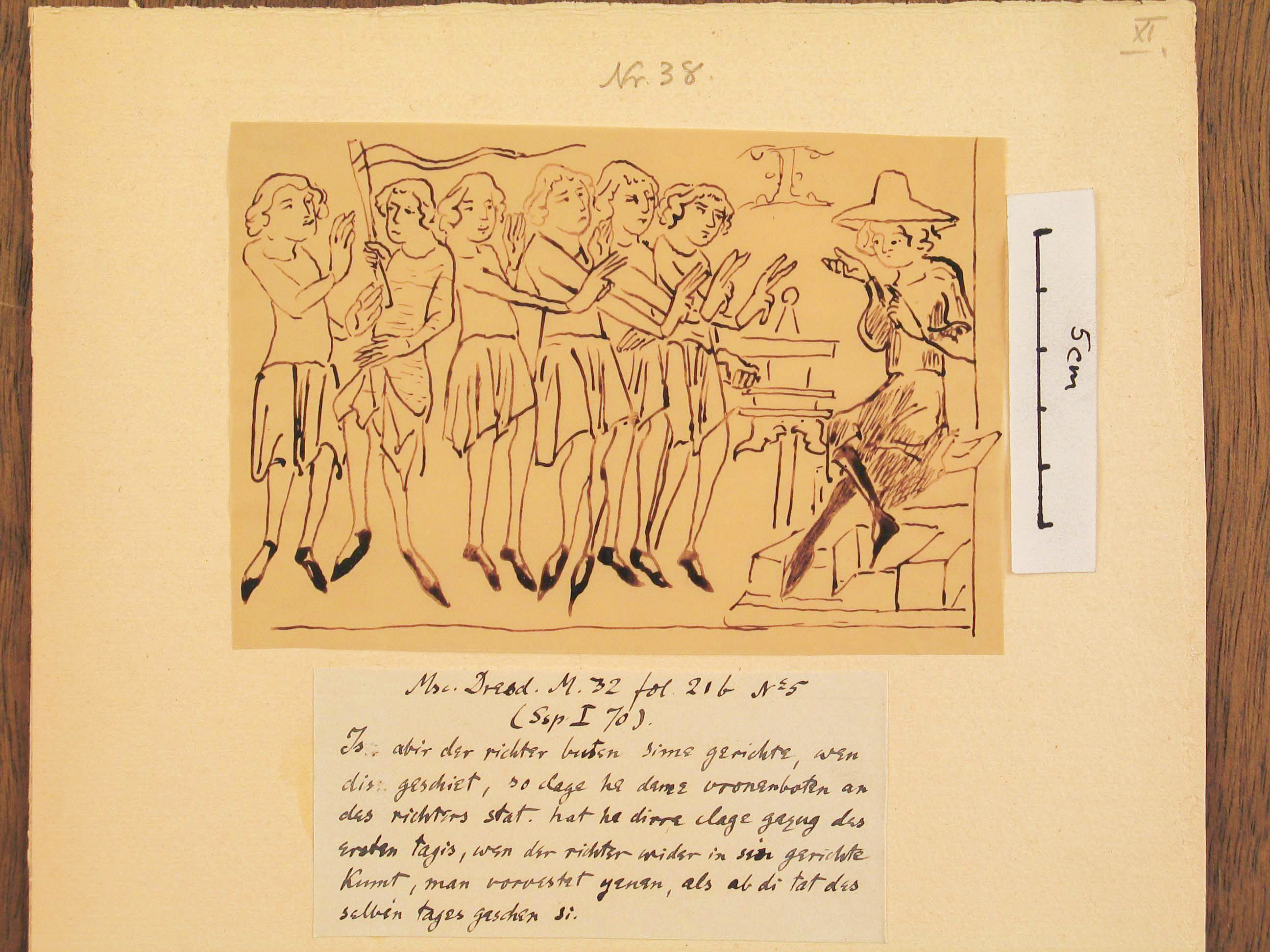 Die Tuschezeichnung auf Pauspapier zeigt einen Richter auf seinem Stuhl. Auf einer Bank vor ihm sitzen sechs Männer. Bildunterschrift : "Ist aber der Richter außerhalb seines Gerichts, wenn dies geschieht, so klage man es dem fronboten an des Richters statt. Hat er für diese Klage Zeugen, so verwertet man jenen am ersten Tage, wo der Richter wieder in sein Gericht kommt, als ob die Tat desselben Tages geschehen sei. " (Hirsch, S. 167)