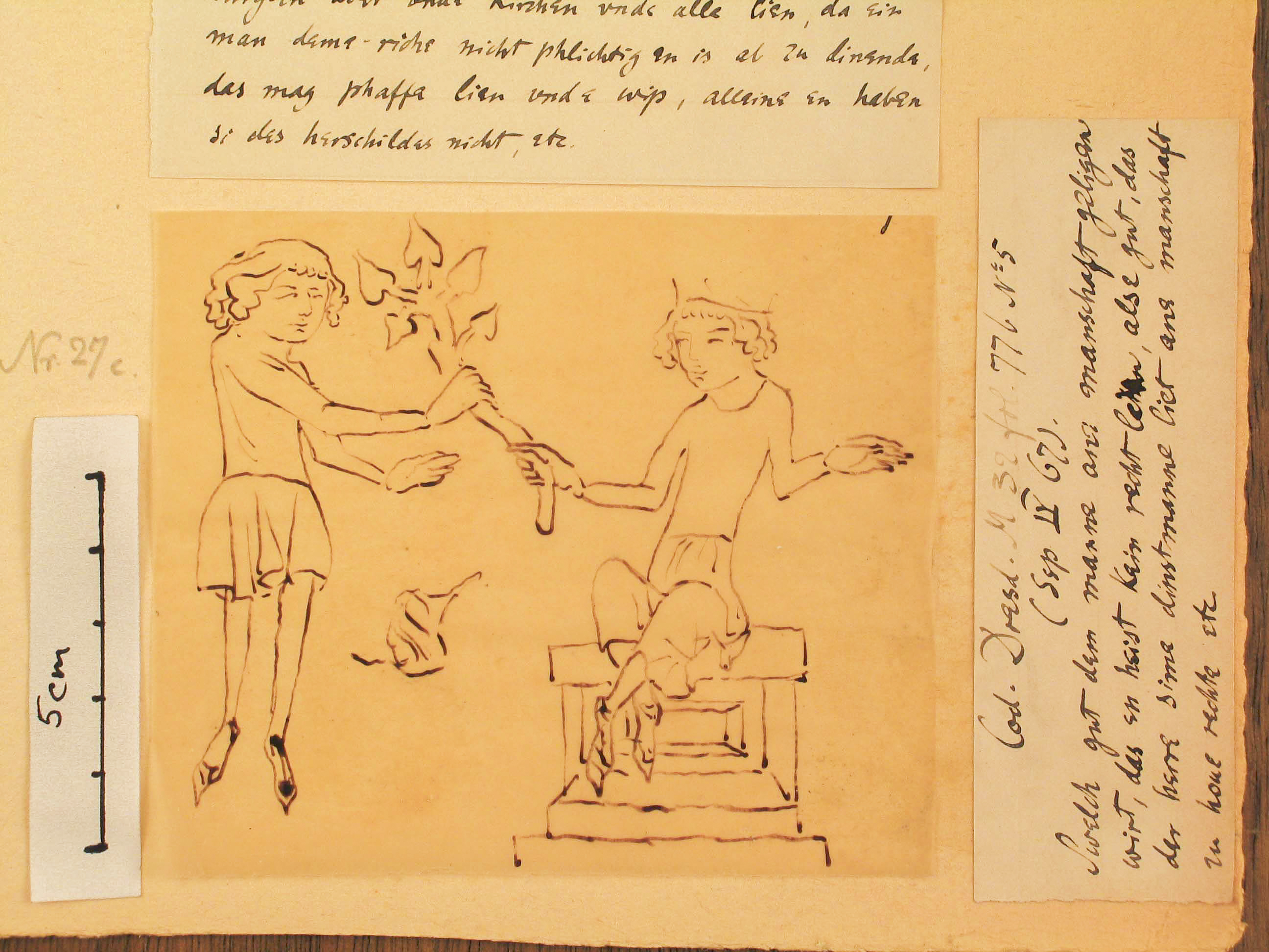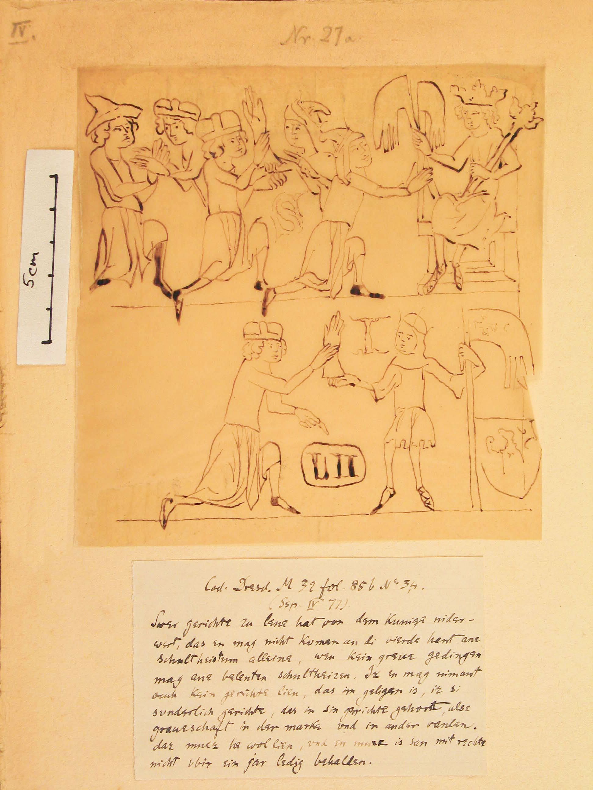 Das stark verschmutzte Blatt trägt drei Tuschezeichnungenn auf Pauspapier. // Die erste Zeichnung ist in zwei Teile gegliedert: OBEN sind viele Menschen zu sehen, die von einem Richter oder König einen Handschuh bzw. eine Fahne erhalten. UNTEN erhält ein der Richter den Handschuh bzw. die Fahne von einem einzelnen zurück. Der Richter blickt zornig drein. Bildunterschrift nach Hirsch: "Wenn jemand mit einem Gerichte belehnt ist, das darf von dem Könige abwärts, nicht in die vierte Hand kommen, ausgenommen allein das Schultheissentum, weil kein Graf ohne den belehnten Schultheiss Gericht halten kann. Es kann ferner niemand ein Gericht weiter verleihen, das ihm verliehen ist, es sei denn ein besonderes Gericht, das in sein Gerichtsgebiet, wie eine Grafschaft in eine Markgrafschaft oder in ein anderes fehnlehn. Das darf er weiter verleiten und darf es sogar von rechts wegen nicht über ein Jahr ledig belassen, ebenso wie der König ein fehnlehn. " // Die zweite Zeichnung zeigt ebenfalls eine Szene, in der ein Mann einen Gegenstand von links (wo zwei Männer stehen) nach rechts wo zwei Männer sitzen, weitergibt. BU nach Hirsch: "Ein burglehn aber und eine kirche und alle anderen lehn, kraft derer ein Mann nicht verpflichtet ist, dem reiche dienst zu leisten, die kann ein pfaffe und eine frau verleihen, obwohl sie nicht lehnsfähig sind etc. " // Die dritte Zeichnung zeigt einen Mann auf einem Thron, der einen Baum hält. Ein zweiter Mann ergreift den Baum. BU nach Hirsch: nicht gefunden.
