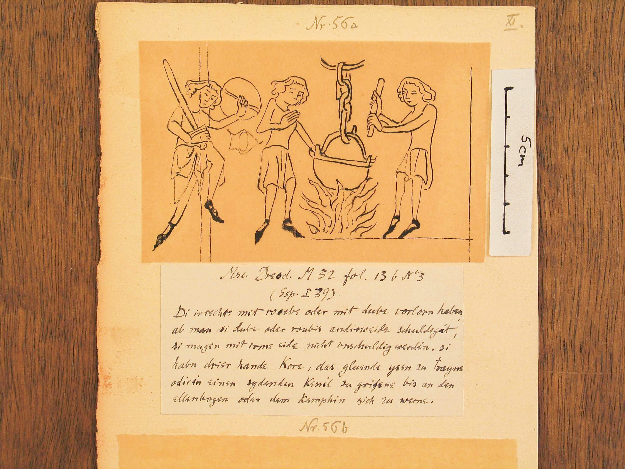 Die beiden Tuschezeichnungen auf Pauspapier zeigen in der oberen Darstellung zwei Männer, die in einem Kessel über einem Feuer rühren und einen dritten mit Schwert und Schild; in der unteren Darstellung wird ein Mann in einem Kessel von einem anderen gerade zu einem kleinen Scheiterhaufen getragen, den zwei andere Männer schüren. Bildunterschrift unter der oberen Darstellung (althochdeutsch): "Die ihre Rechte mit Raub oder dube verloren haben, ab man sie dube oder Raube anderweitg beschuldigt, sie mögen mit irme side nicht unschuldig werden. . . . "