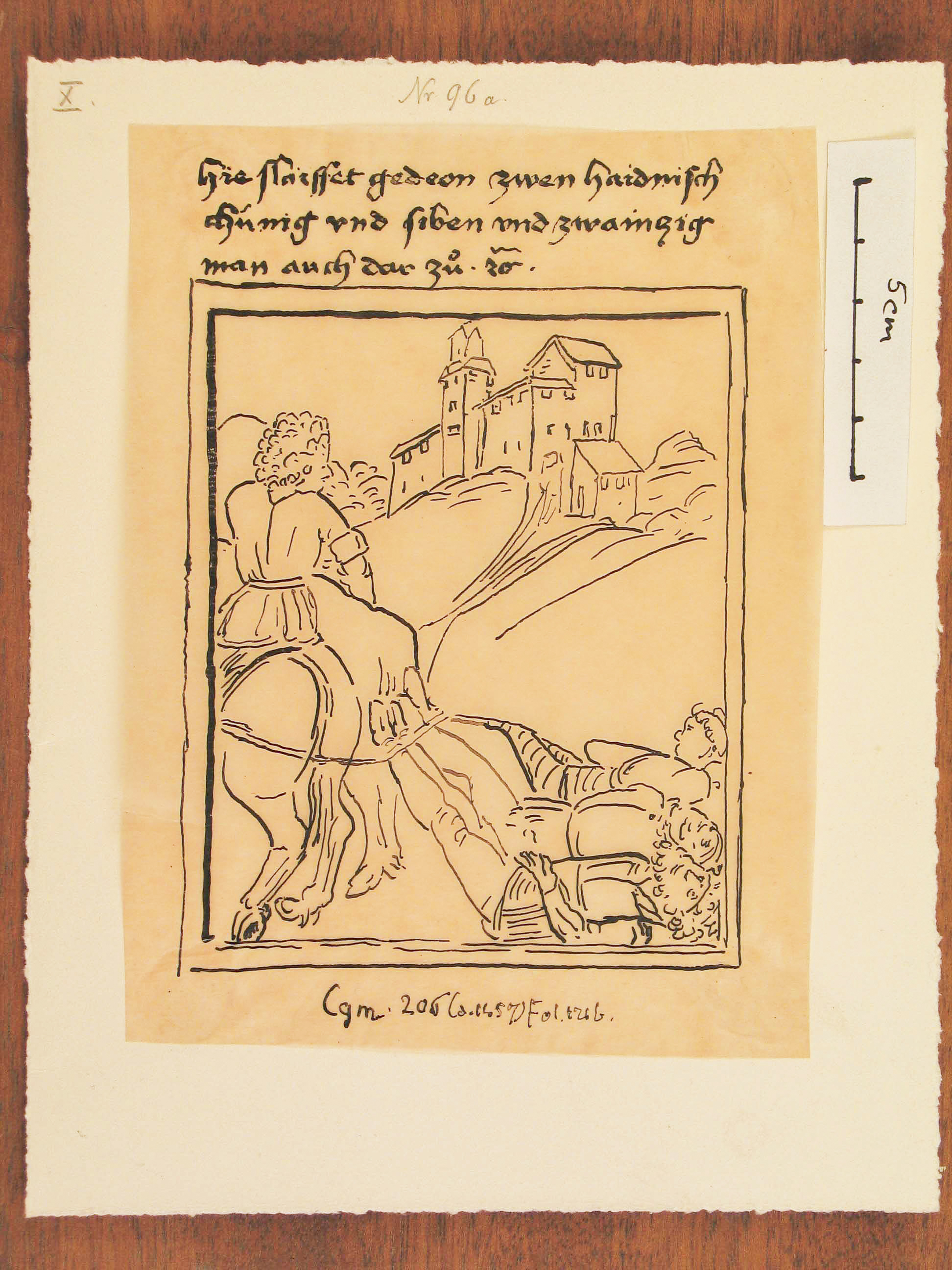Tuschzeichnung auf Pauspapier. Im Vordergrund links ein Reiter auf einem Pferd, der sich gerade nach rechts- also hinten- umdreht. Hinten am Pferd sind drei Menschen an den Füßen mit einem Seil festgebunden. Sie werden hinter dem Pferd am Boden hergeschliffen. Im Hintergrund steht eine Burg auf einem Hügel. Oben über der Darstellung steht eine dreizeilige altdeutsche Schrift.