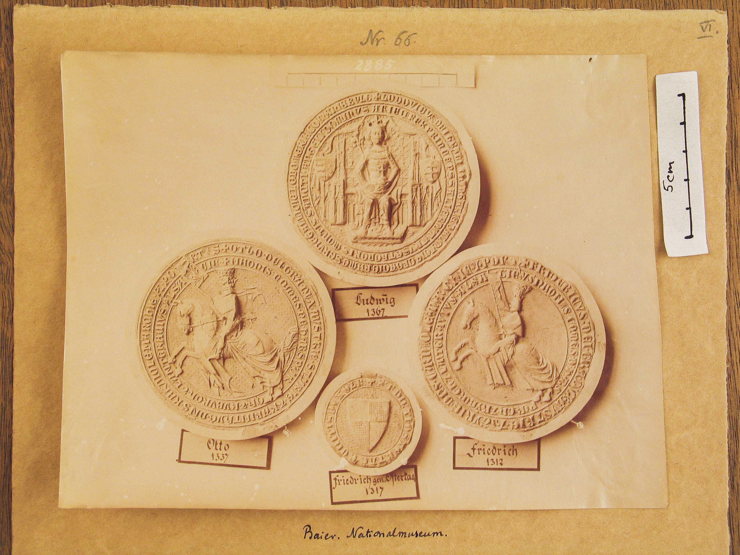 Das Foto zeigt vier Siegel, angeordnet in Rautenform. Oben Ludwig, 1367, zeigt einen Mann auf einem Thron. Links Otto (1337), zeigt Mann mit Pferd. Unten Friedrich genannt Ostertag (?), 1317, zeigt ein Wappen. Rechts Friedrich, 1312, zeigt Mann auf Pferd.