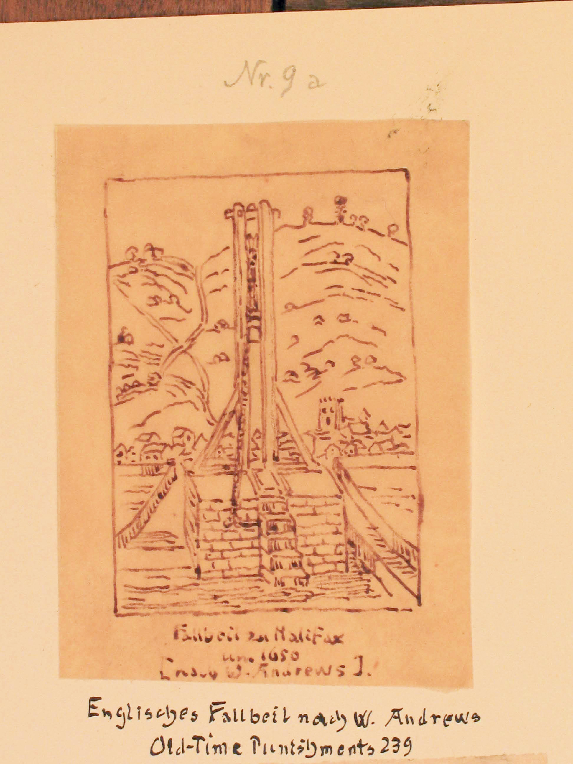 UNTERE ZEICHNUNG: Stehendes Fallbeil auf gemauertem Fundament mit gemauerter Treppe hinauf zum Schafott. Im Hintergrund hügelige Landschaft mit kleinen Gebäuden. Bildunterschrift auf dem Pauspapier: "Fallbeil zu Halifax, um 1650". Bildunterschrift auf dem Trägerkarton: "Englisches Fallbeil nach W. Andrews Old Time Punishments 239".