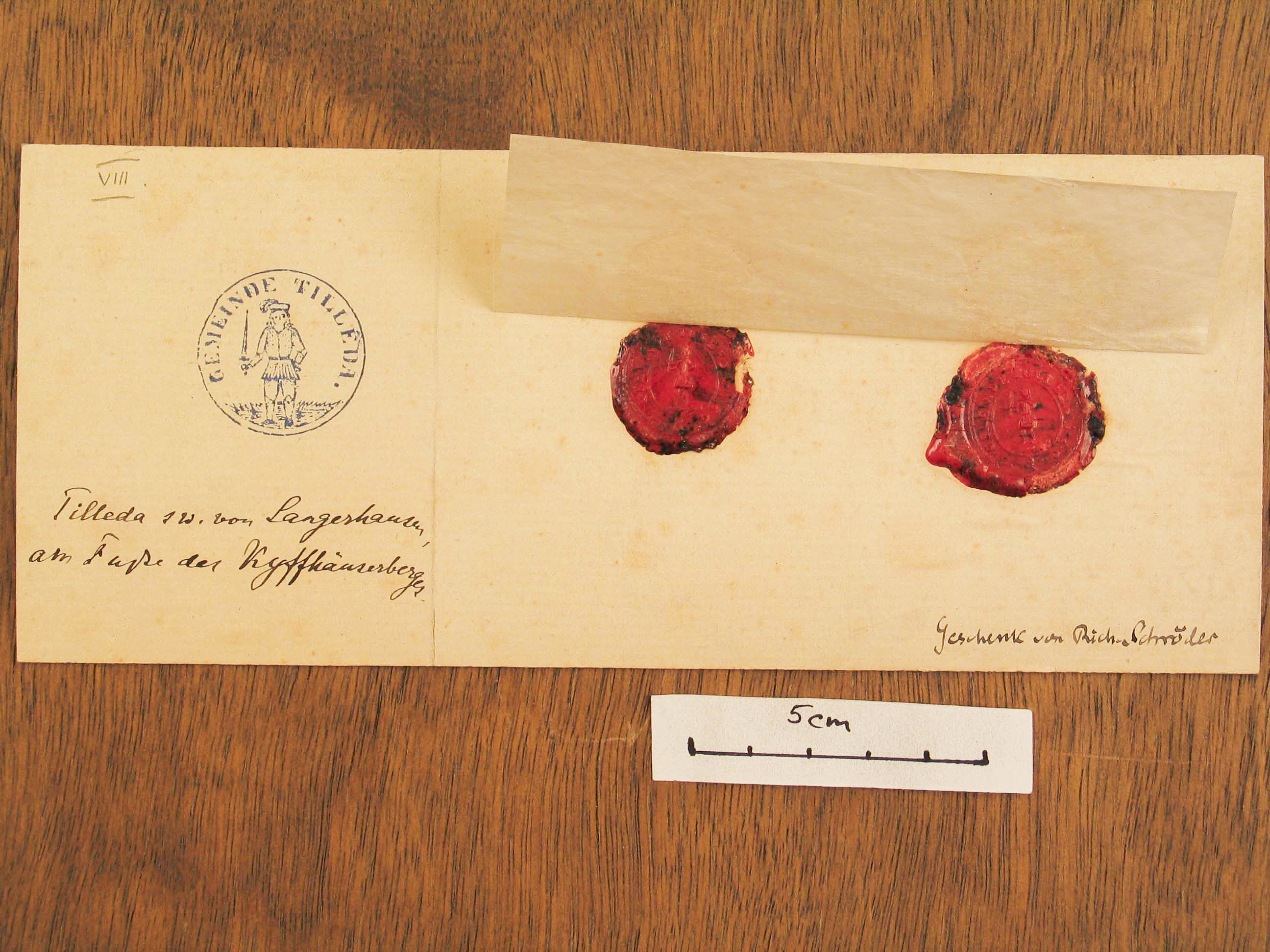 Der Karton trägt einen Stempelabdruck und zwei Siegelabdrücke auf Siegellack. // Der Stempel ist kreisrund. Er zeigt einen stehenden Mann in herrschaftlichem Gewand, der ein langes, spitzes Schwert in der rechten Hand trägt. Ringsum (am Kreisrand) die Bezeichnung "Gemeinde Tilleda". // Die (identischen) Siegel daneben zeigen dasselbe Motiv. Die Randbezeichnung lautet jeweils "Gemeinde Tulleda, 1897".