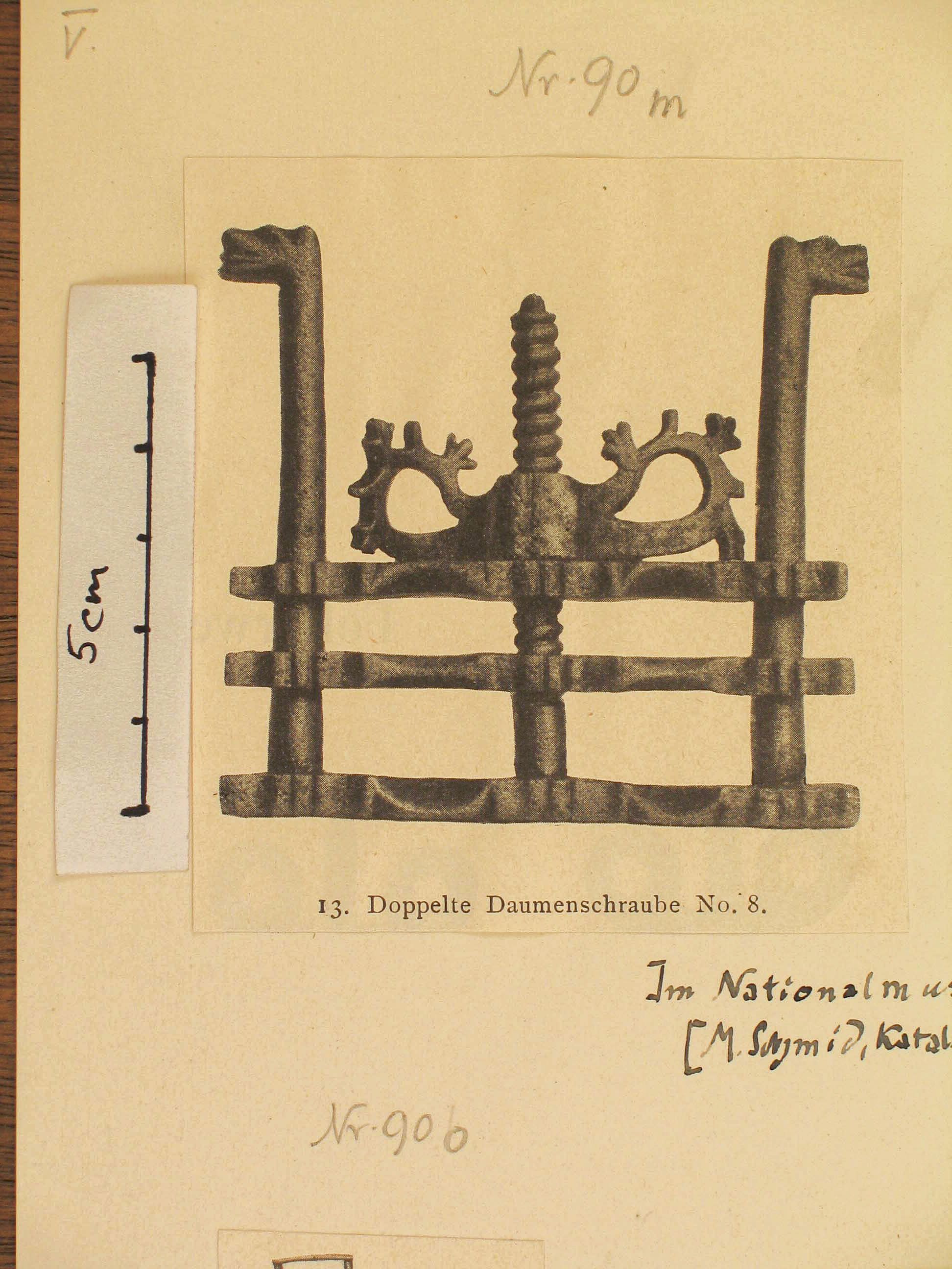 (90p) Zwei Daumenschrauben, die linke ist oben geschlossen, die rechte geöffnet. Unterschrift: "Samml. E. Brott (Aukt. Katal. Nr. 573a, bzw. 573b)".