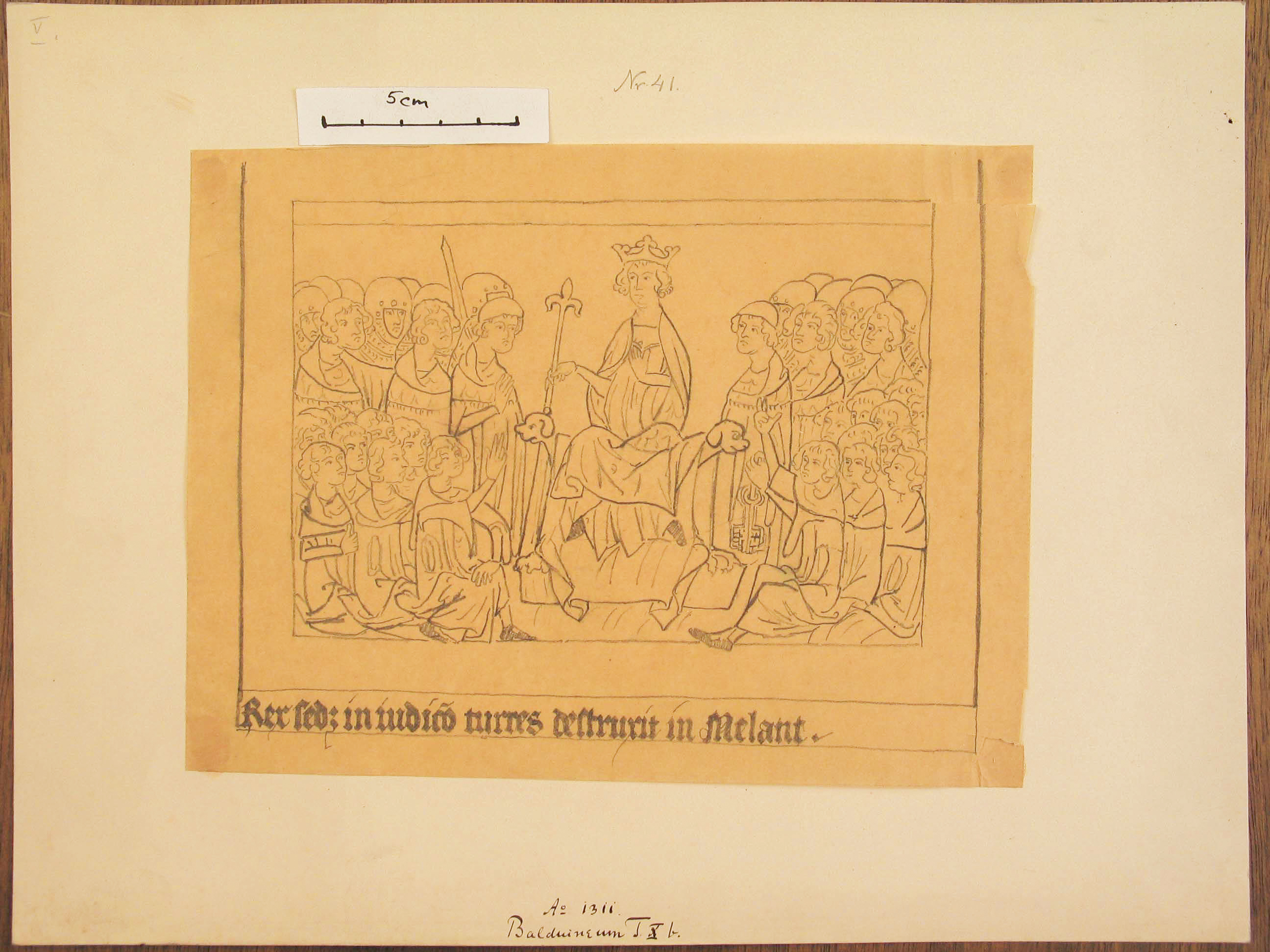 Tuschezeichnung auf Pauspapier. In der Mitte sitzt erhoben ein Mann mit Krone und Stab/Zepter in der Hand. Rechts und links von ihm stehen sich zwei nahezu identische Gruppen von Menschen gegenüber. Dabei stehen hinten jeweils viele Soldaten mit Helmen, und vorne sitzen mehrere Menschen ohne Helme oder Mützen. Der jeweils Vorderste erhebt die Hand wie zum Schwur gegen den jeweils anderen. Dabei hat der Rechte in der anderen Hand eine Art großen Schlüssel. Unter der Darstellung steht das Ende eines lateinischen Satzes.