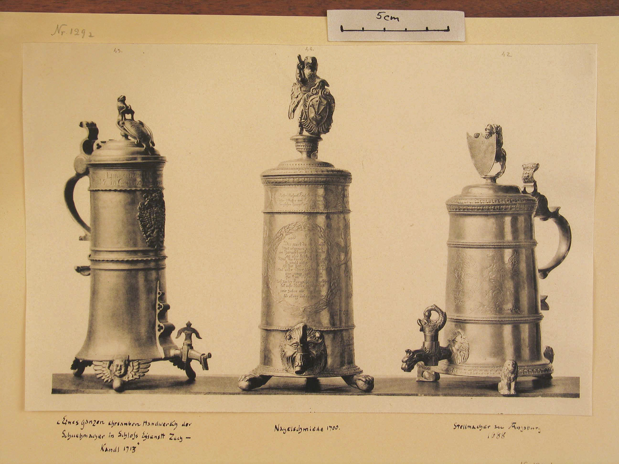 Das Blatt trägt vier Fotos aus einem Auktionskatalog. Das oberste Bild zeigt drei Krüge, vermutlich aus Zinn, die reich dekoriert sind. Es handelt sich nach Angabe Amiras um die Zunftkannen der Schuhmacher, der Nagelschmiede und der Stellmacher. --- Links unten ein Bild mit einem einzelnen Krug, Zunftkrug der Böttiger. --- Das Bild unten mitte zeigt zwei Zunftkrüge der Schuhmacher aus Regensburg und der Schmiede zu Mergentheim. --- Rechts unten befindet sich das Bild einer Ochsenstatue, die mit Ketten wohl an die Decke gehängt werden soll (Zunftzeichen der Augsburger Metzger).
