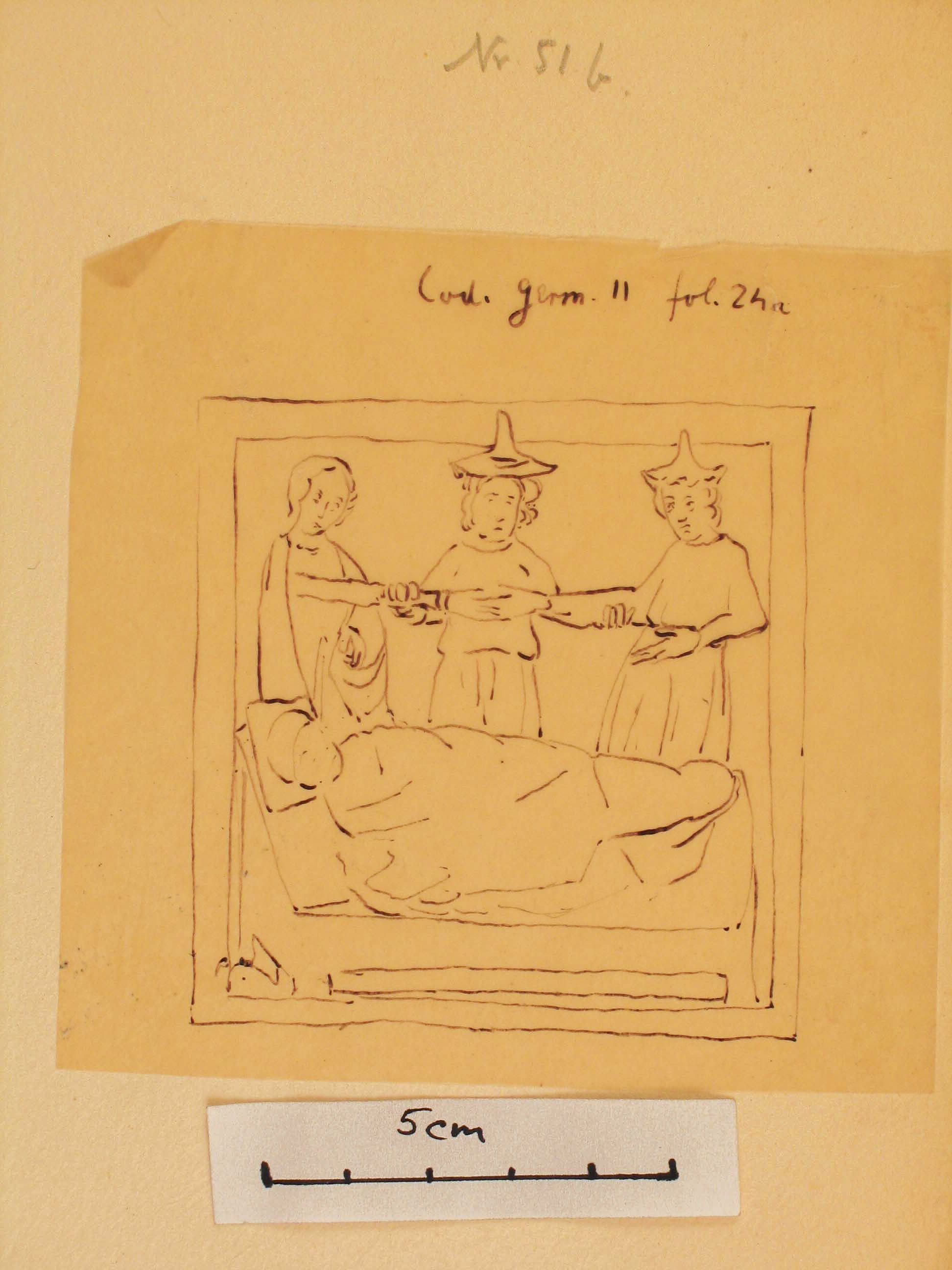 Das Blatt trägt zwei Tuschezeichnungen auf Pauspapier. Die erste Zeichnung zeigt einen Mann und eine Frau, die sich in Gegenwart eines Dritten die Hand reichen. Die zweite Zeichnung zeigt einen Mann und eine Frau, die sich in Gegenwart eines Dritten die Hand reichen, während im Vordergrund ein Mann im Bett liegt.